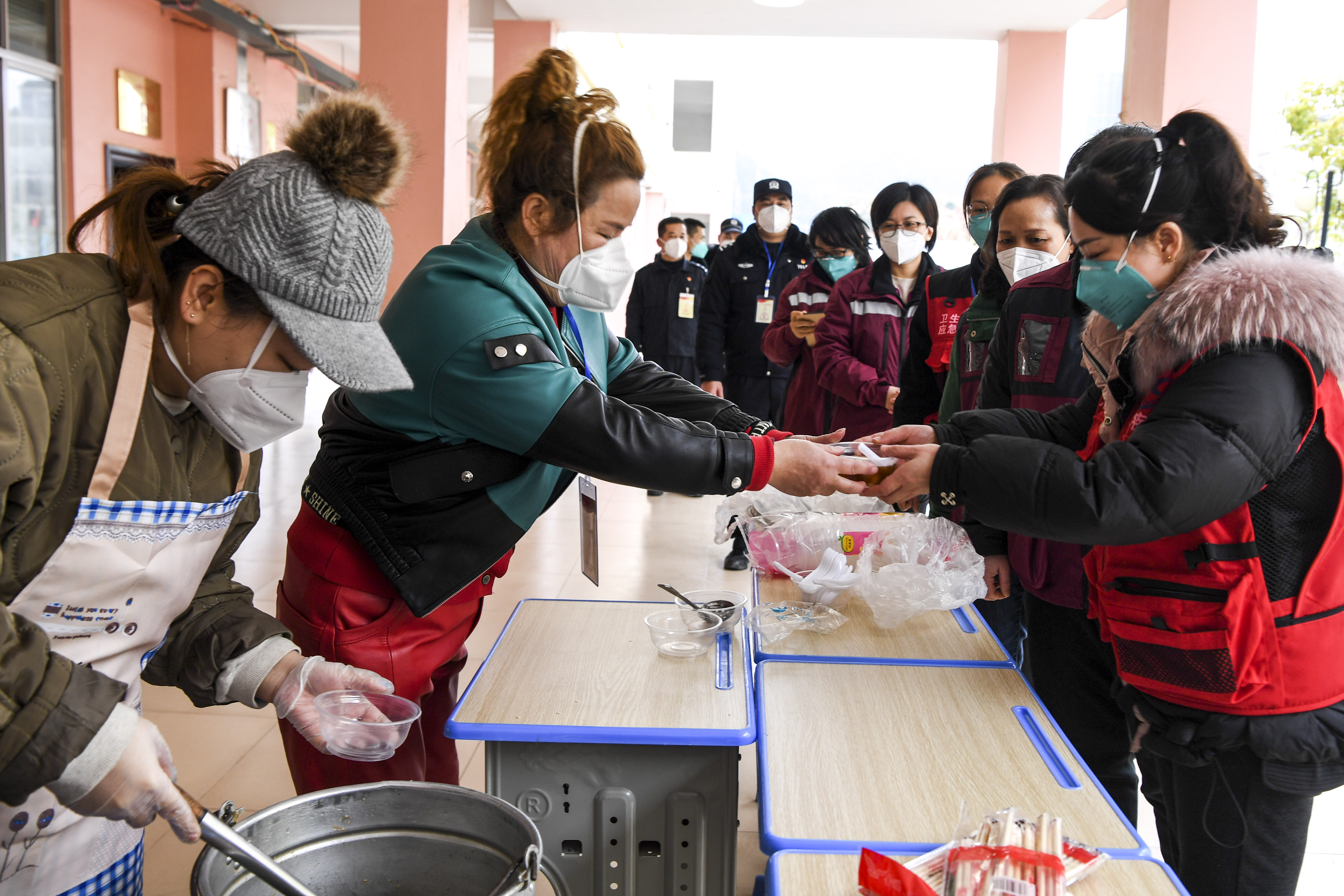 2月15日,德保县城关镇莲城社区工作人员黄佩妮(左二)和志愿者一起为抗疫一线的工作人员送汤圆。新华社记者 曹祎铭 摄