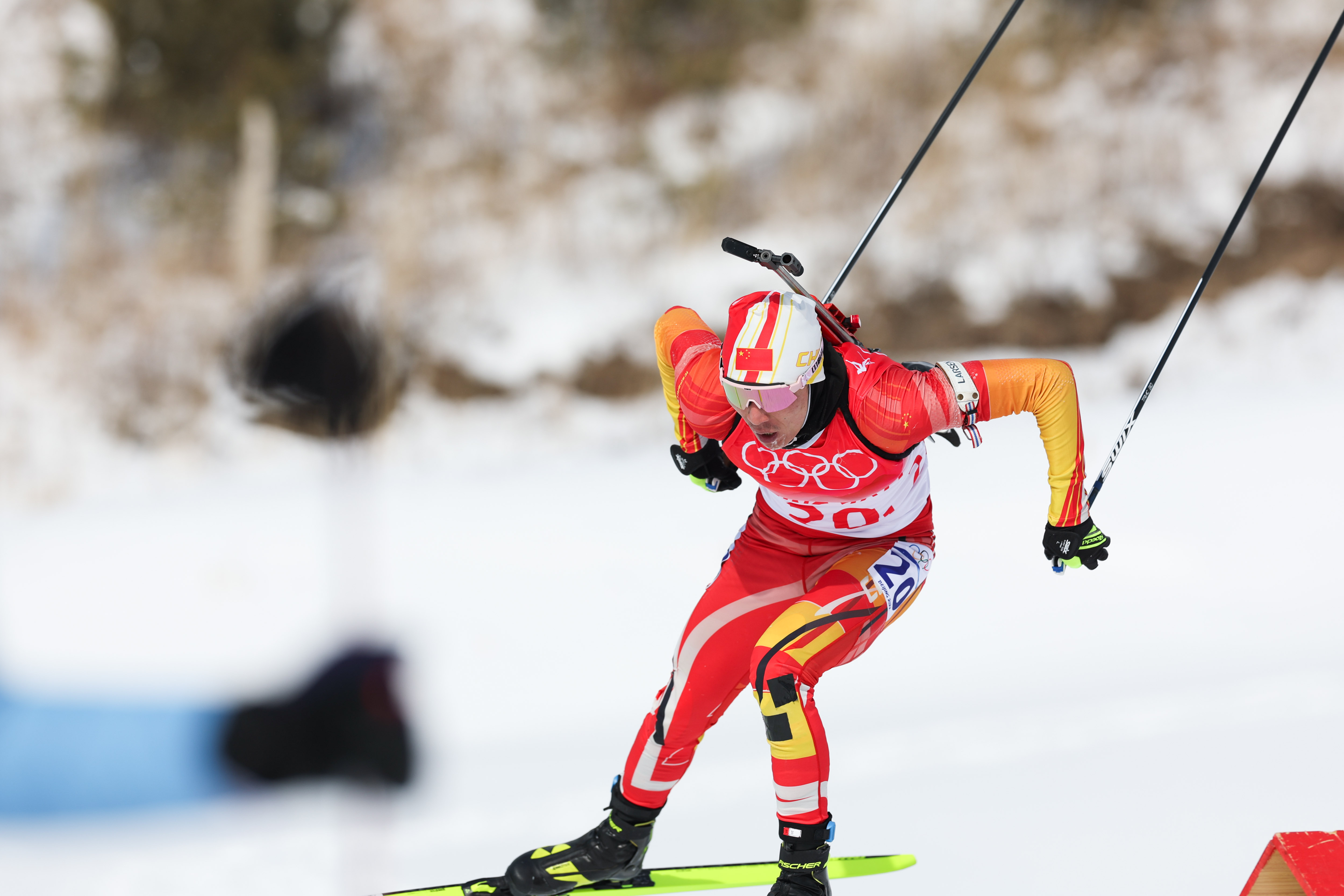 2月15日,中国队选手程方明在北京冬奥会冬季两项男子4×7.5公里接力中。 新华社记者丁汀摄