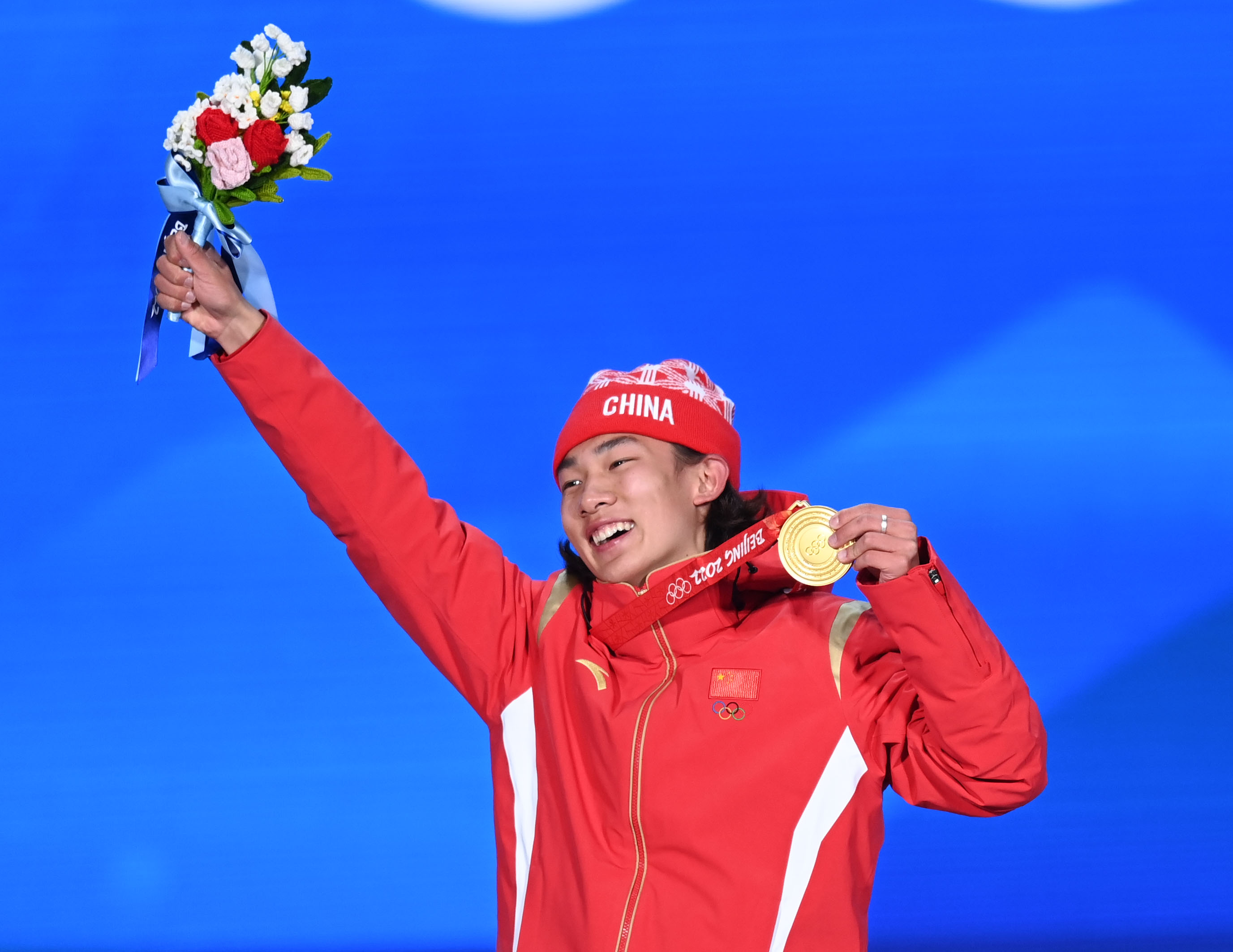 2月15日,冠军中国选手苏翊鸣在北京冬奥会单板滑雪男子大跳台奖牌颁发仪式上。新华社记者黄宗治摄