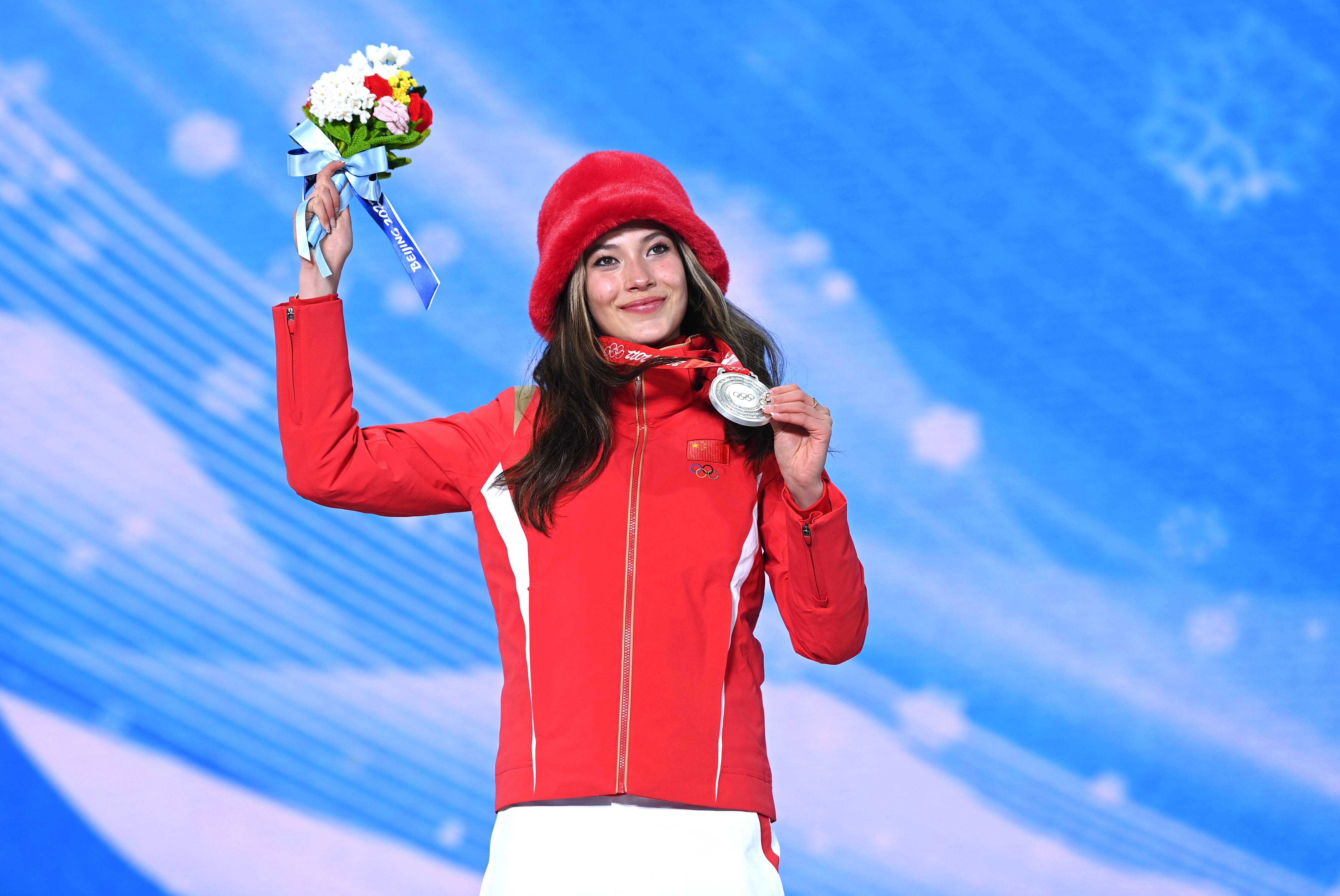 2月15日,谷爱凌在北京冬奥会自由式滑雪女子坡面障碍技巧比赛中夺得银牌。新华社记者胡虎虎摄