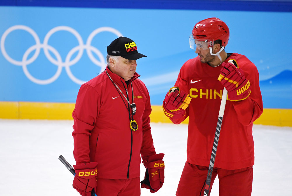 2月2日,中国男子冰球队运动员叶劲光在赛前训练中与主教练赞那塔·伊万诺(左)交流。新华社记者李紫恒摄