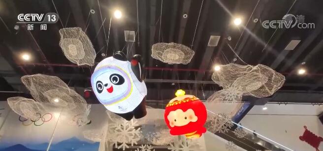 在北京冬奥会主媒体中心场馆,一组巨大的北京冬奥会和冬残奥会吉祥物彩灯悬挂在场馆内上空,憨态可掬,引人注目,以遨游太空的身姿欢迎远道而来的朋友们,向世界讲述着北京2022精彩美好的故事。