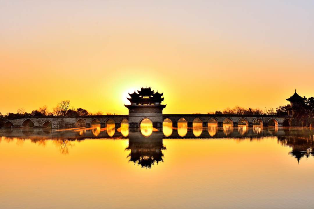 在云南建水双龙桥,暖阳初升,朝晖穿过桥洞映照水面,17道金色光晕闪烁,形成“金光穿洞”的极致景观,如梦如幻。