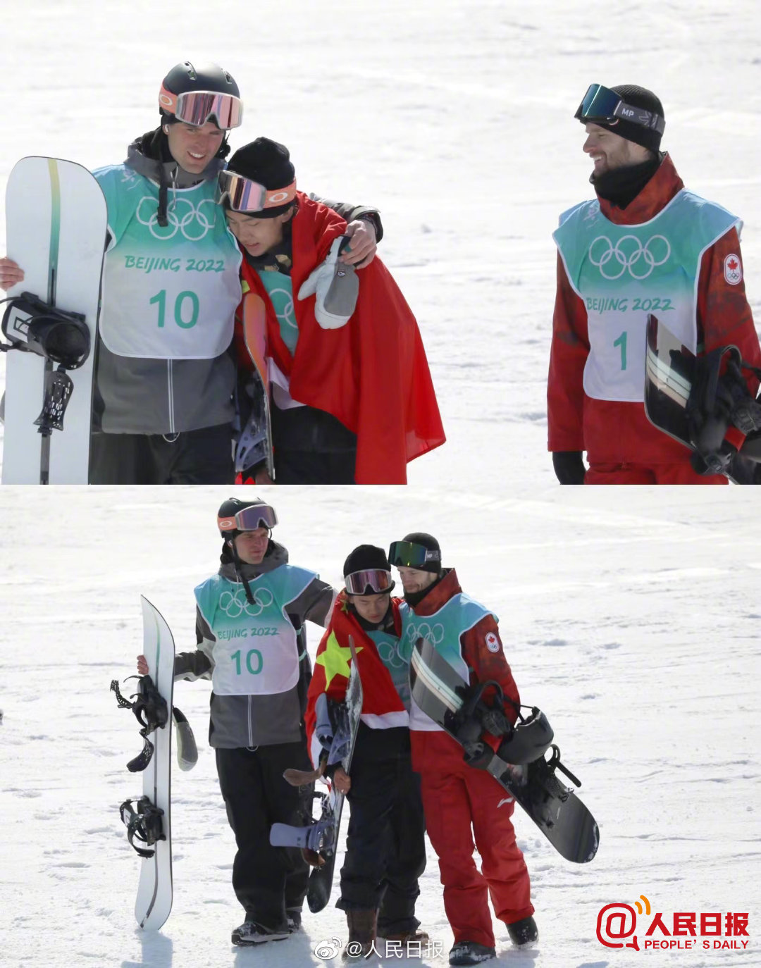 暖心一幕!苏翊鸣夺金后被偶像拥入怀中。