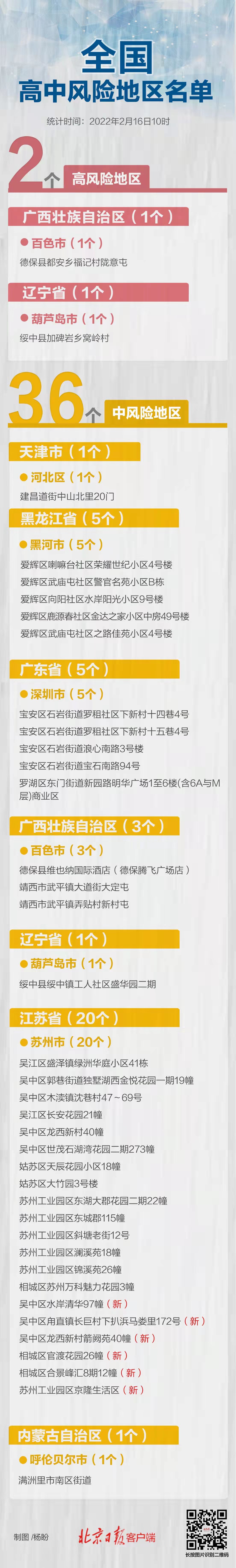 自2022年2月16日7时起,将江苏省苏州市吴中区水岸清华97幢、吴中区甪直镇长巨村下扒浜马娄里172号、吴中区龙西新村箭阙苑40幢、相城区官渡花园26幢、相城区合景峰汇8期12幢、苏州工业园区京隆生活区等6地调整为中风险地区。