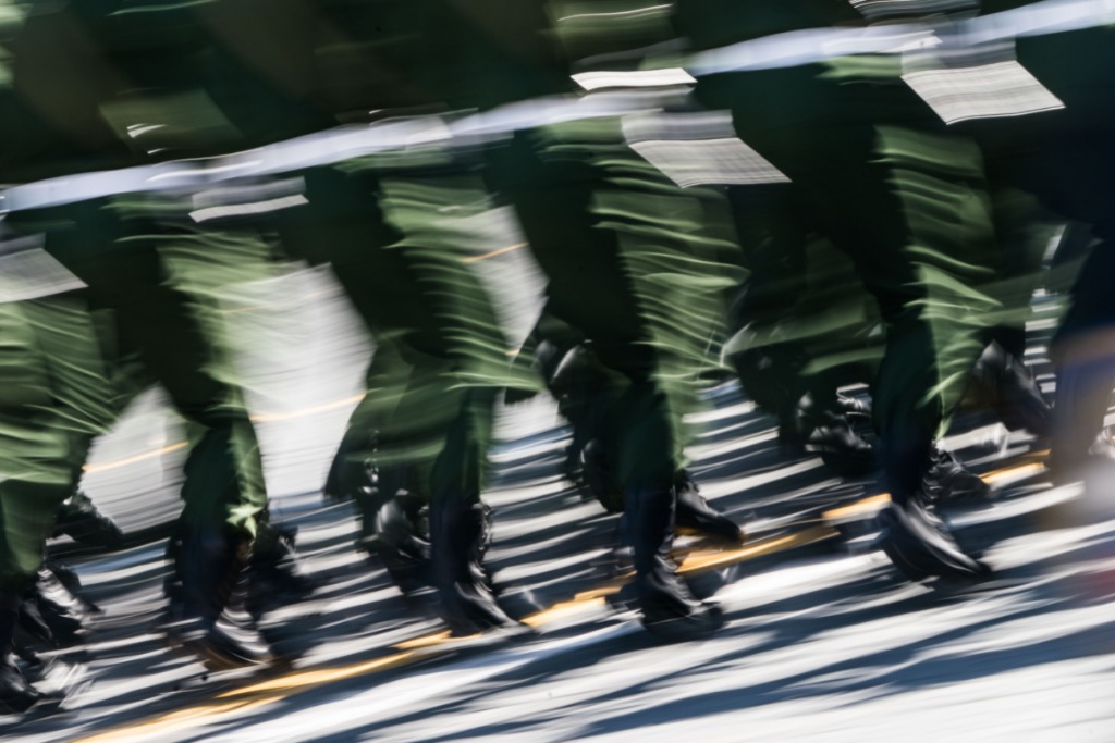 2018年5月9日,在俄罗斯莫斯科,俄军士兵参加阅兵式。(新华社记者吴壮摄)