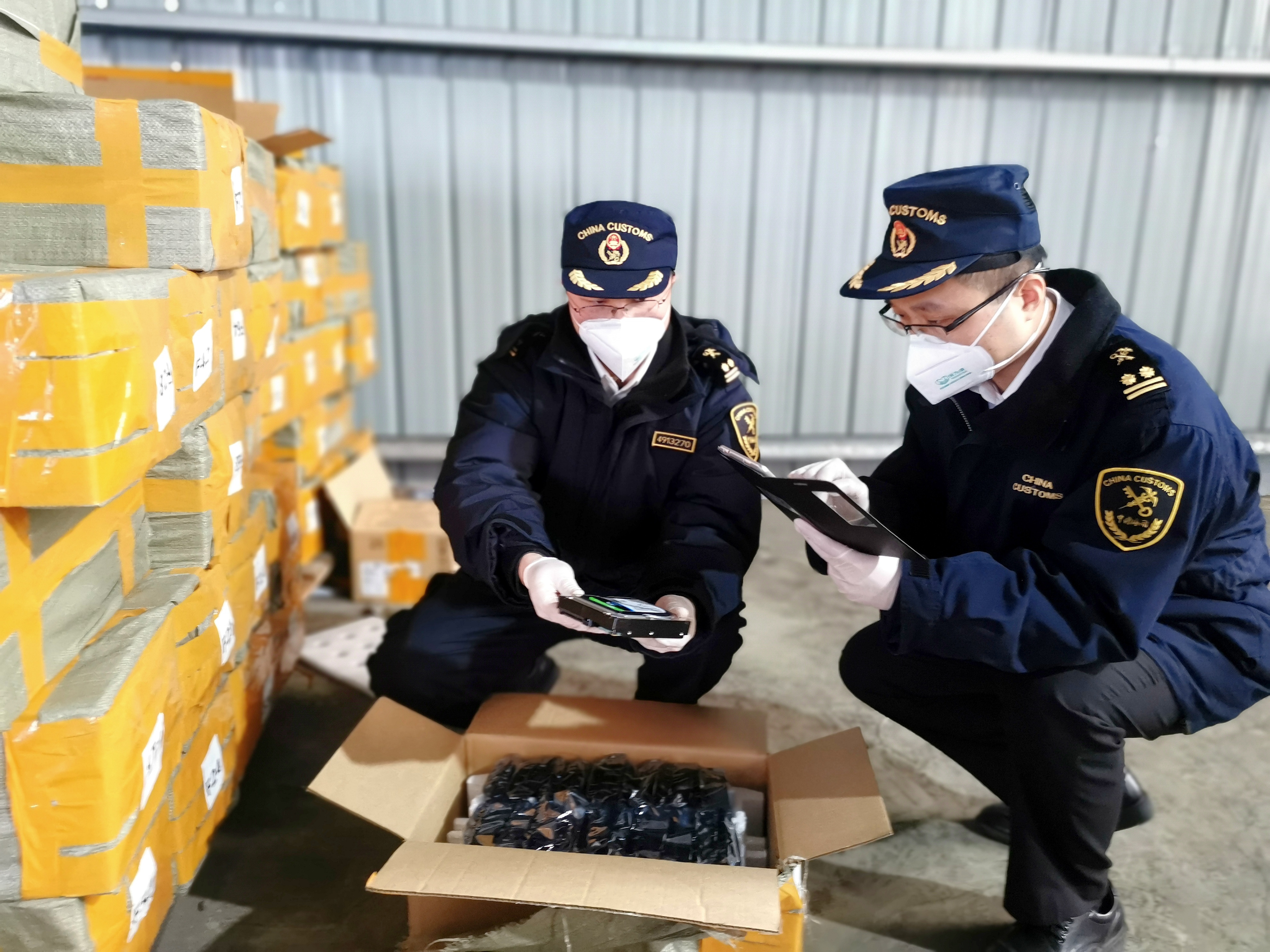 图为1月25日,衡阳海关关员对查获的涉嫌侵权货物进行清点。(长沙海关供图)