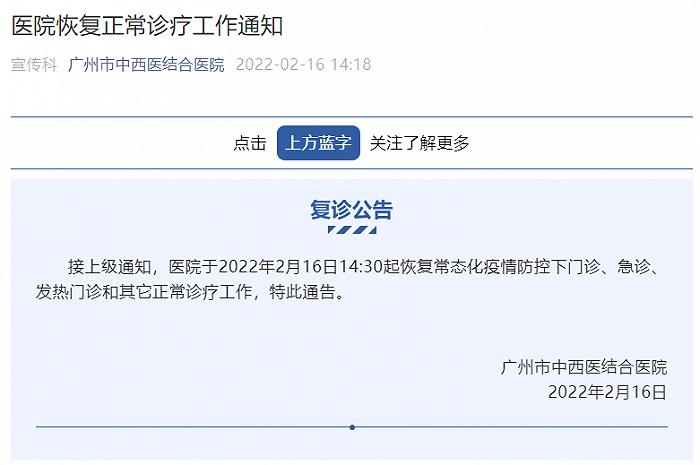 广州市中西医结合医院2月16日发布公告,接上级通知,医院于2022年2月16日14:30起恢复常态化疫情防控下门诊、急诊、发热门诊和其它正常诊疗工作。