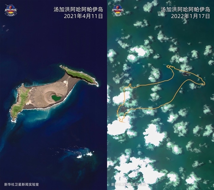 这张拼版照片显示的是:2021年4月11日Worldview02卫星拍摄的汤加洪阿哈阿帕伊岛卫星图片(左)和2022年1月17日“高分一号”卫星拍摄的该岛火山喷发后的卫星图片,橘色曲线为按照地理坐标标注出的岛屿原先轮廓。(新华社发,新华社卫星新闻实验室供图)