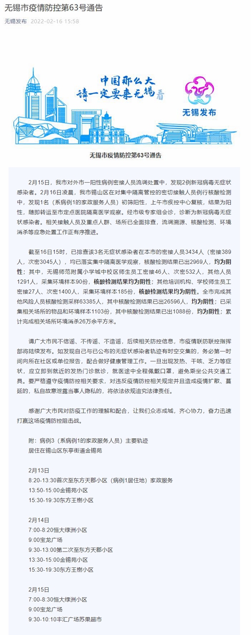 据无锡发布消息,2月15日,我市对外市一阳性病例密接人员流调处置中,发现2例新冠病毒无症状感染者。2月16日凌晨,我市锡山区在对集中隔离管控的密切接触人员例行核酸检测中,发现1名(系病例1的家政服务人员)初筛阳性,上午市疾控中心复核,结果为阳性,随即转运至市定点医院隔离医学观察。经市级专家组会诊,诊断为新冠病毒无症状感染者。