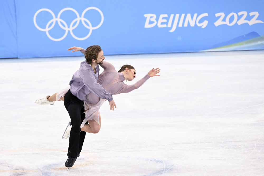 2月14日,美国选手凯特琳·霍维耶克(右)和让-吕克·贝克在比赛中。当日,北京2022年冬奥会花样滑冰冰上舞蹈自由舞比赛在首都体育馆举行。新华社记者 马宁 摄