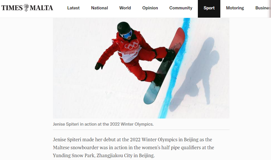 斯皮泰里在北京冬奥会上的故事近日频频出现在马耳他媒体报端。当地主流媒体《马耳他时报》报道说,马耳他以其地中海阳光而闻名,但北京冬奥会上的单板滑雪运动员珍妮斯·斯皮泰里却在执行一项“不太可能的任务”——让岛国马耳他登上冰雪运动舞台。