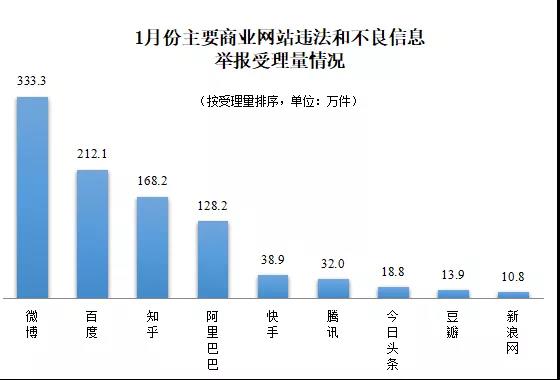 在全国主要网站受理的举报中,微博、百度、知乎、阿里巴巴、快手等主要商业网站受理量达968.6万件。