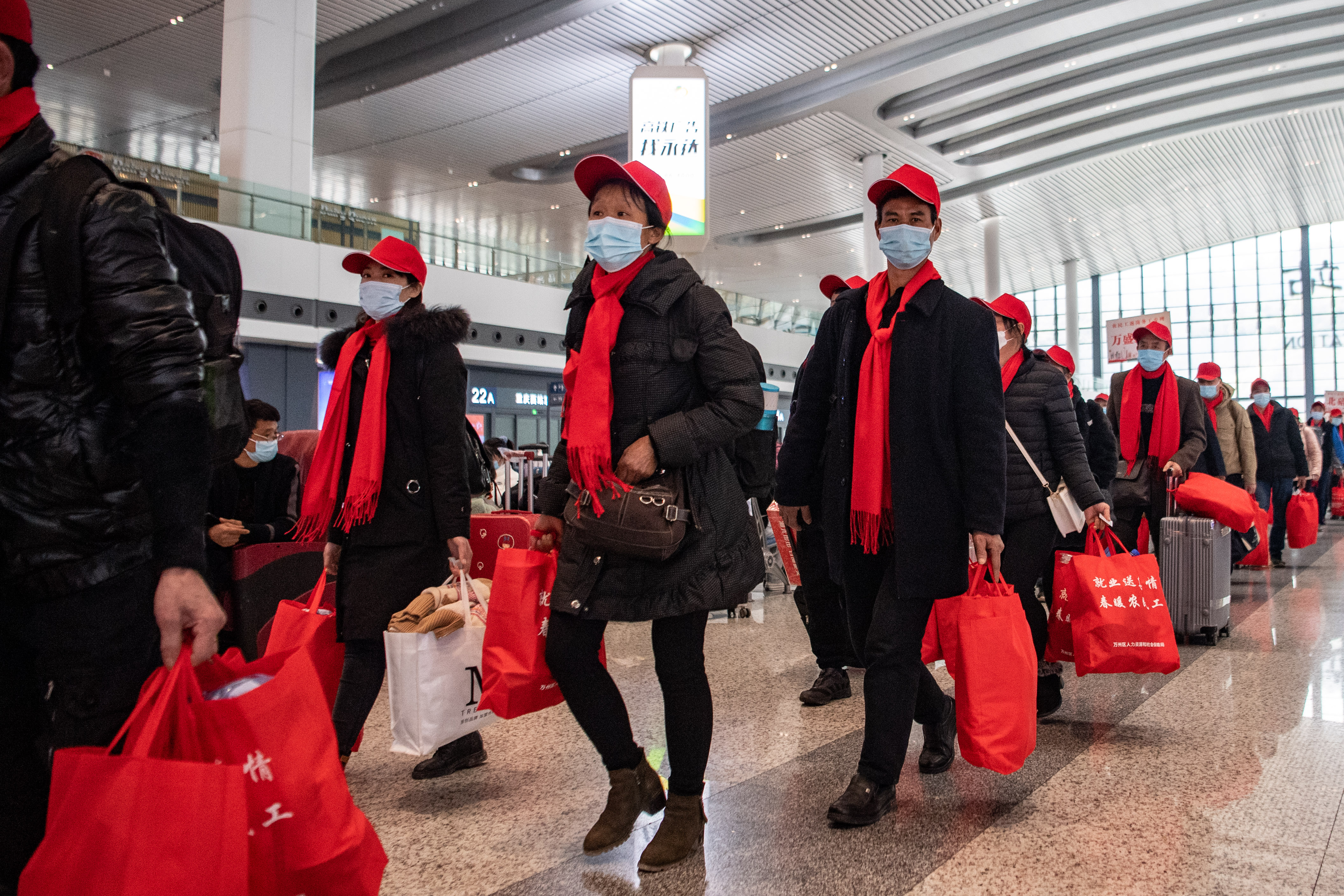 新华社照片,重庆,2022年2月16日 重庆今年首趟返岗务工免费专列开行 2月16日,返岗务工人员在重庆西站候车厅排队前往检票口。 当日,在做好疫情防控工作的前提下,800余名返岗务工人员免费乘坐D1877次列车,从重庆西站出发,前往广东省返岗务工。这是重庆今年开行的首趟返岗务工人员复工专列。 新华社记者 唐奕 摄