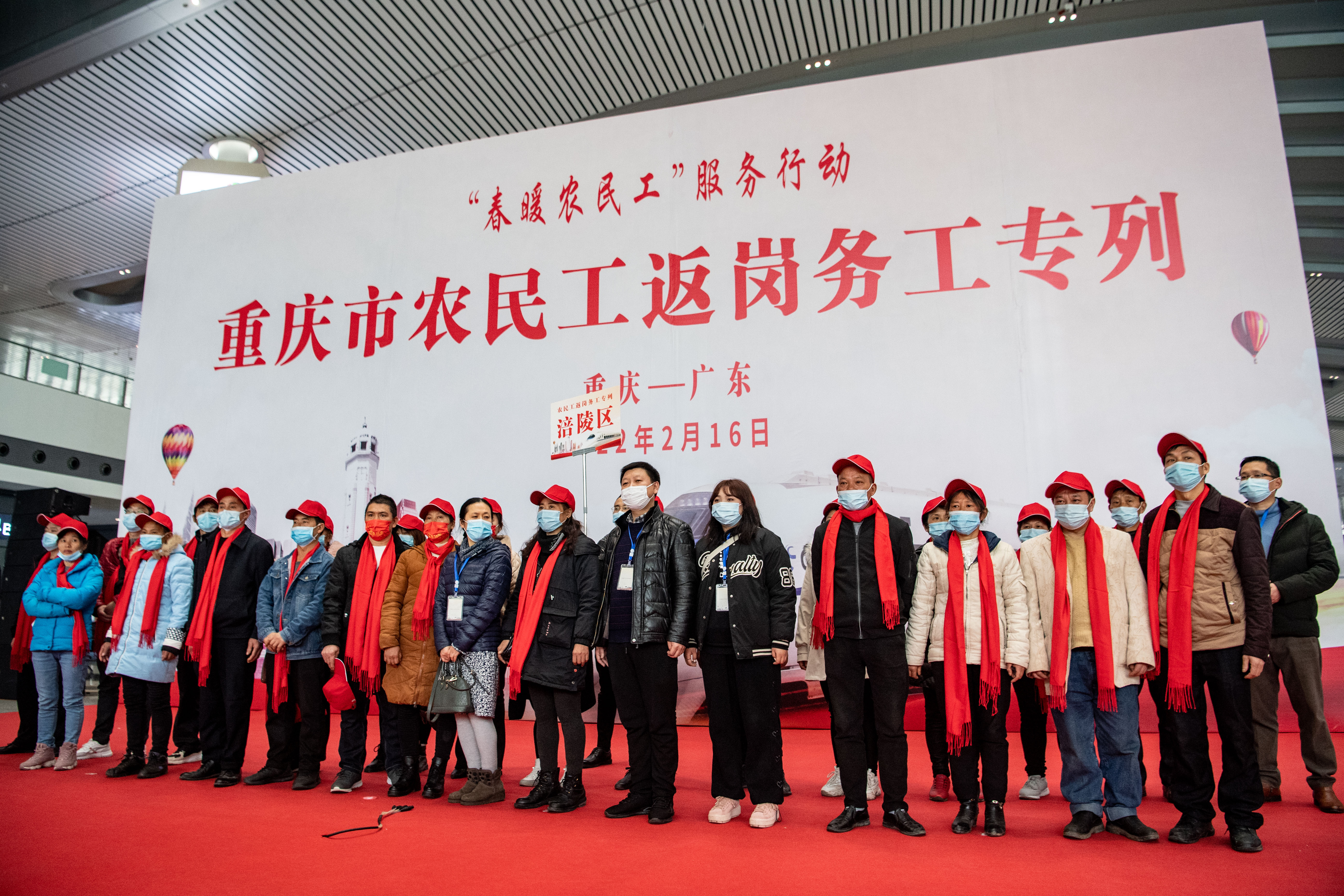 新华社照片,重庆,2022年2月16日 重庆今年首趟返岗务工免费专列开行 2月16日在重庆西站拍摄的返岗务工人员欢送仪式。 当日,在做好疫情防控工作的前提下,800余名返岗务工人员免费乘坐D1877次列车,从重庆西站出发,前往广东省返岗务工。这是重庆今年开行的首趟返岗务工人员复工专列。 新华社记者 唐奕 摄