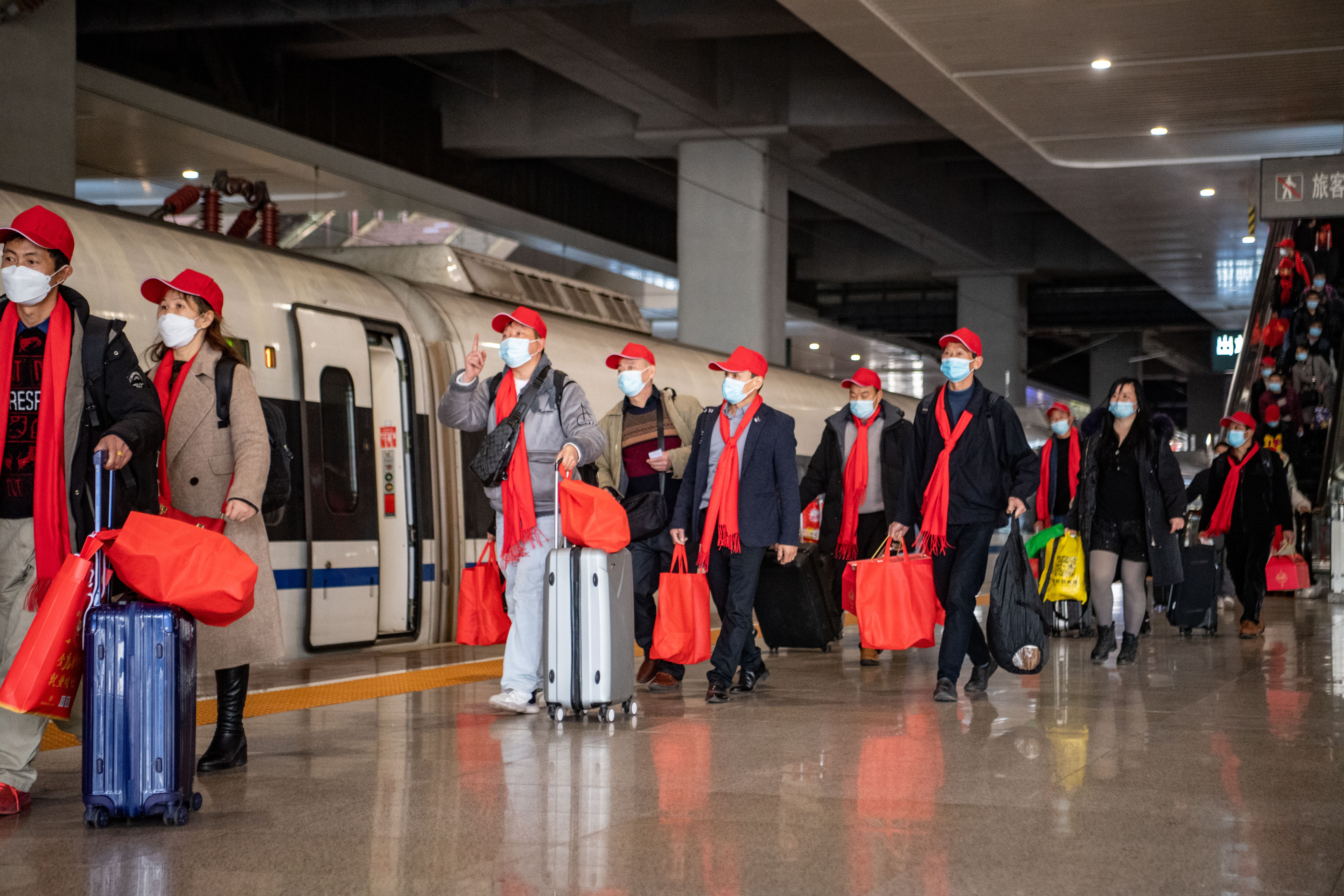 新华社照片,重庆,2022年2月16日 重庆今年首趟返岗务工免费专列开行 2月16日,返岗务工人员在重庆西站乘车。 当日,在做好疫情防控工作的前提下,800余名返岗务工人员免费乘坐D1877次列车,从重庆西站出发,前往广东省返岗务工。这是重庆今年开行的首趟返岗务工人员复工专列。 新华社记者 唐奕 摄