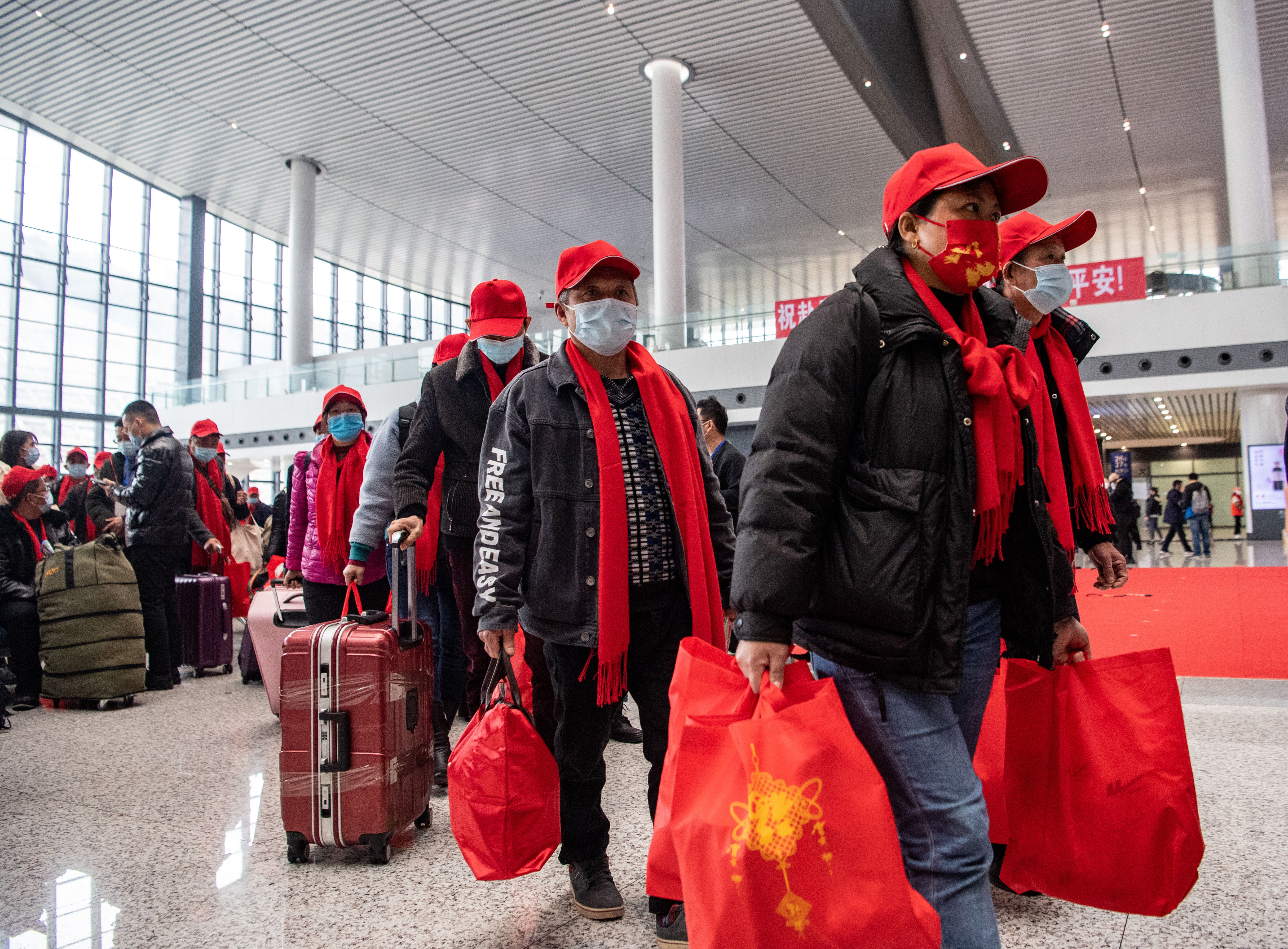 新华社照片,重庆,2022年2月16日 重庆今年首趟返岗务工免费专列开行 2月16日,返岗务工人员在重庆西站候车厅排队前往检票口。 当日,在做好疫情防控工作的前提下,800余名返岗务工人员免费乘坐D1877次列车,从重庆西站出发,前往广东省返岗务工。这是重庆今年开行的首趟返岗务工人员复工专列。 新华社记者 唐奕 摄