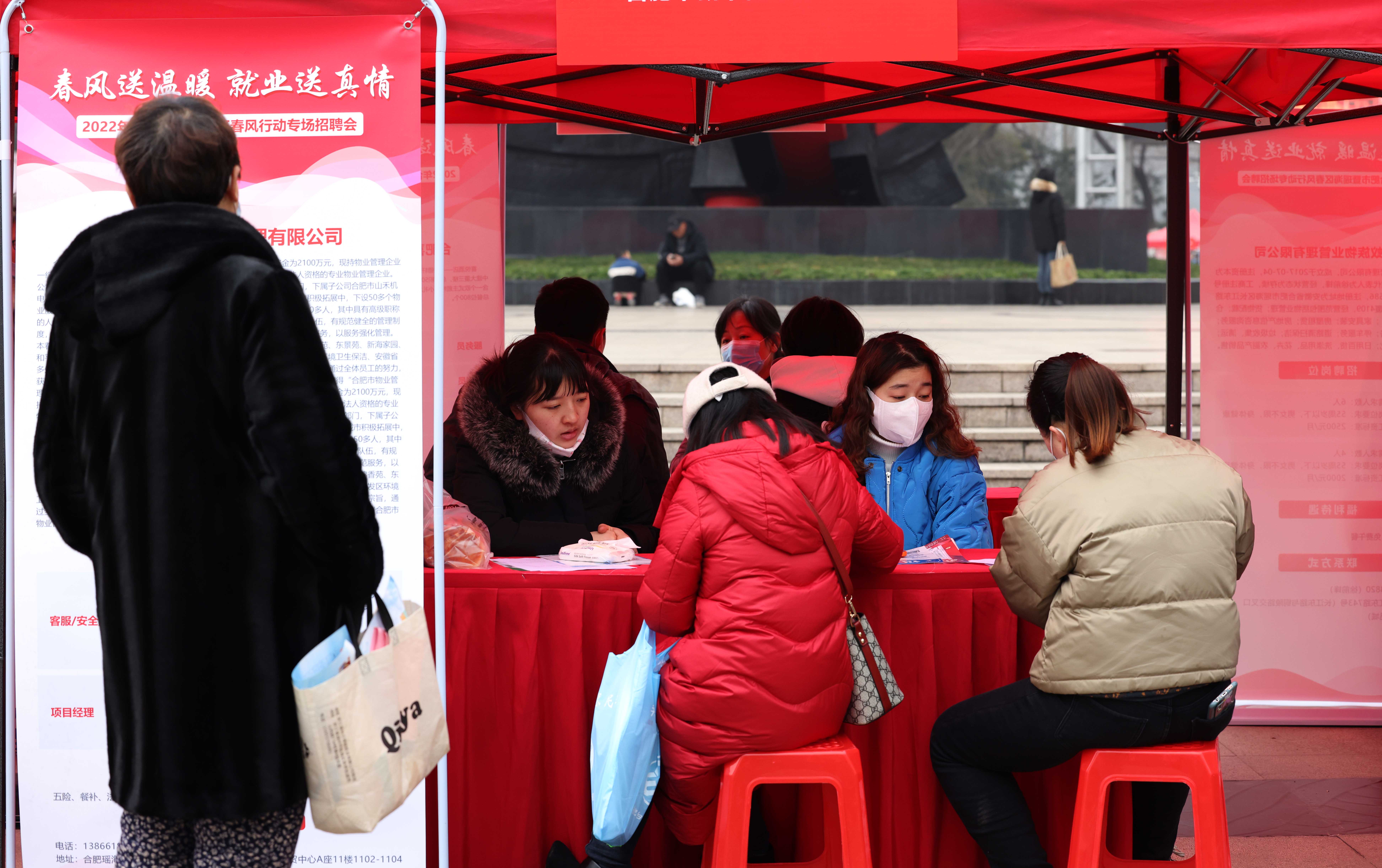 新华社照片,合肥,2022年2月16日 “春风行动”助就业 2月16日,求职者在合肥市暨瑶海区“春风行动”专场招聘会现场咨询。 当日,2022年合肥市暨瑶海区“春风行动”专场招聘会在瑶海区和平广场举行,参与招聘会的合肥市重点企业和用人单位提供5000余个就业岗位。招聘会同步开展线上“直播带岗”,并为群众开展就业创业政策、职业技能培训、劳动监察维权、社会保险转接等政策咨询活动。 新华社发(解琛 摄)