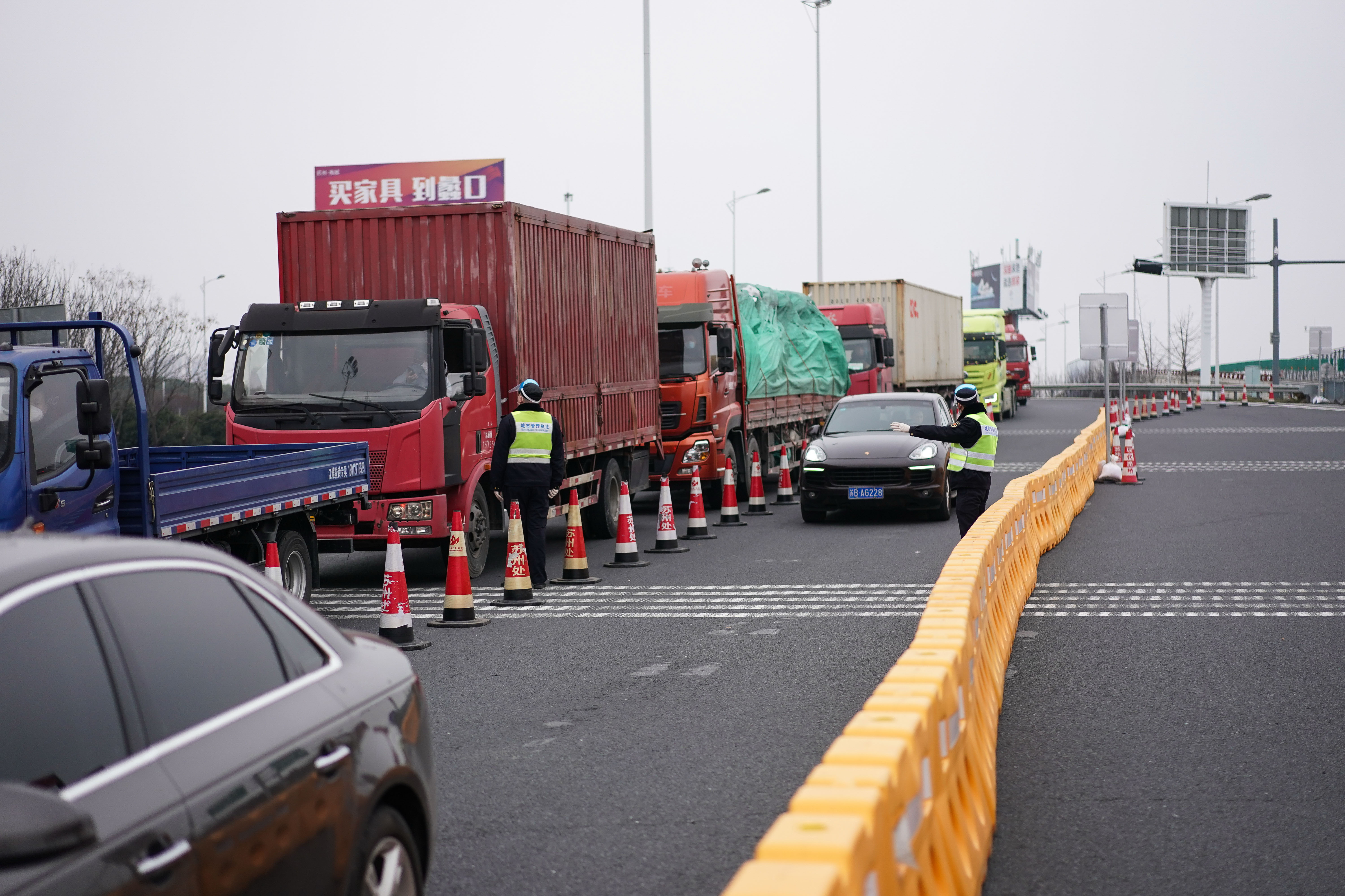 新华社照片,苏州(江苏),2022年2月16日 防扩散防外溢——苏州紧锣密鼓战“疫”一线见闻 2月15日,执法人员在京沪高速公路苏州新区收费站查验。 当前,江苏苏州正处在抗击疫情关键时刻,疫情防控措施进一步升级。通过开展核酸检测,加快流调溯源和分析研判,全面开展重点人员排查,严格做好密接、次密接及各类重点人群健康管控以及实施离城通道管控等措施,当地政府和广大群众并肩携手,争分夺秒,尽快切断传播链,遏制疫情内部扩散和外溢,努力在最短时间内扑灭疫情。 截至2月16日15时,苏州本轮疫情累计报告确诊病例35例,无症状感染者7例。 新华社记者 季春鹏 摄