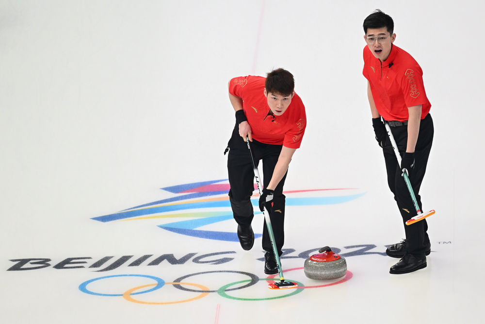 2月16日,中国队选手王智宇(左)和许静韬在北京冬奥会男子冰壶循环赛中。新华社记者马宁摄