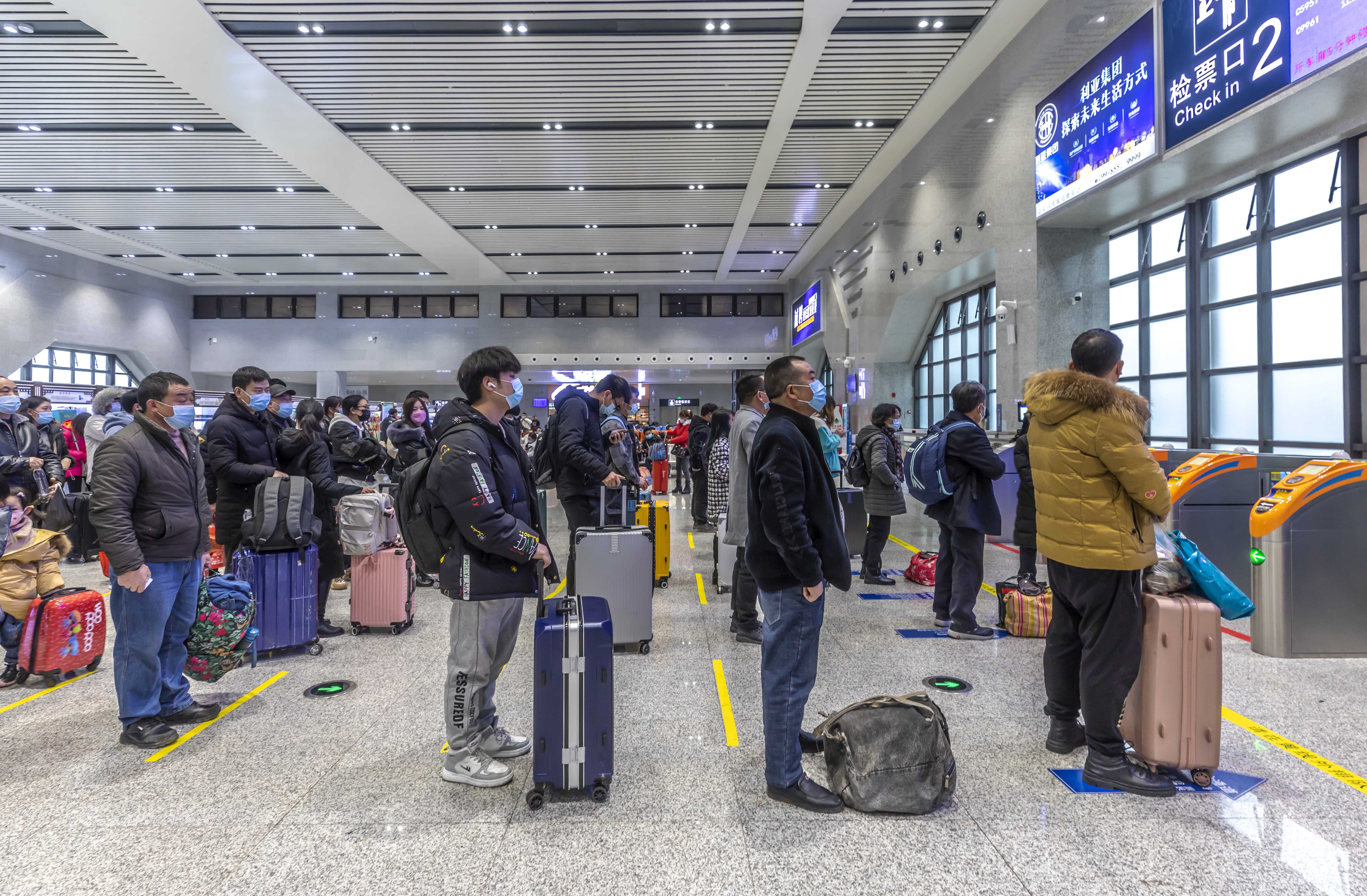 新华社照片,黔西(贵州),2022年2月16日 各地铁路迎来节后客流出行高峰 2月16日,旅客在贵州省黔西高铁站检票口排队候车。 当日是元宵节后第一天,各地铁路迎来节后客流出行高峰。 新华社发(范晖摄)