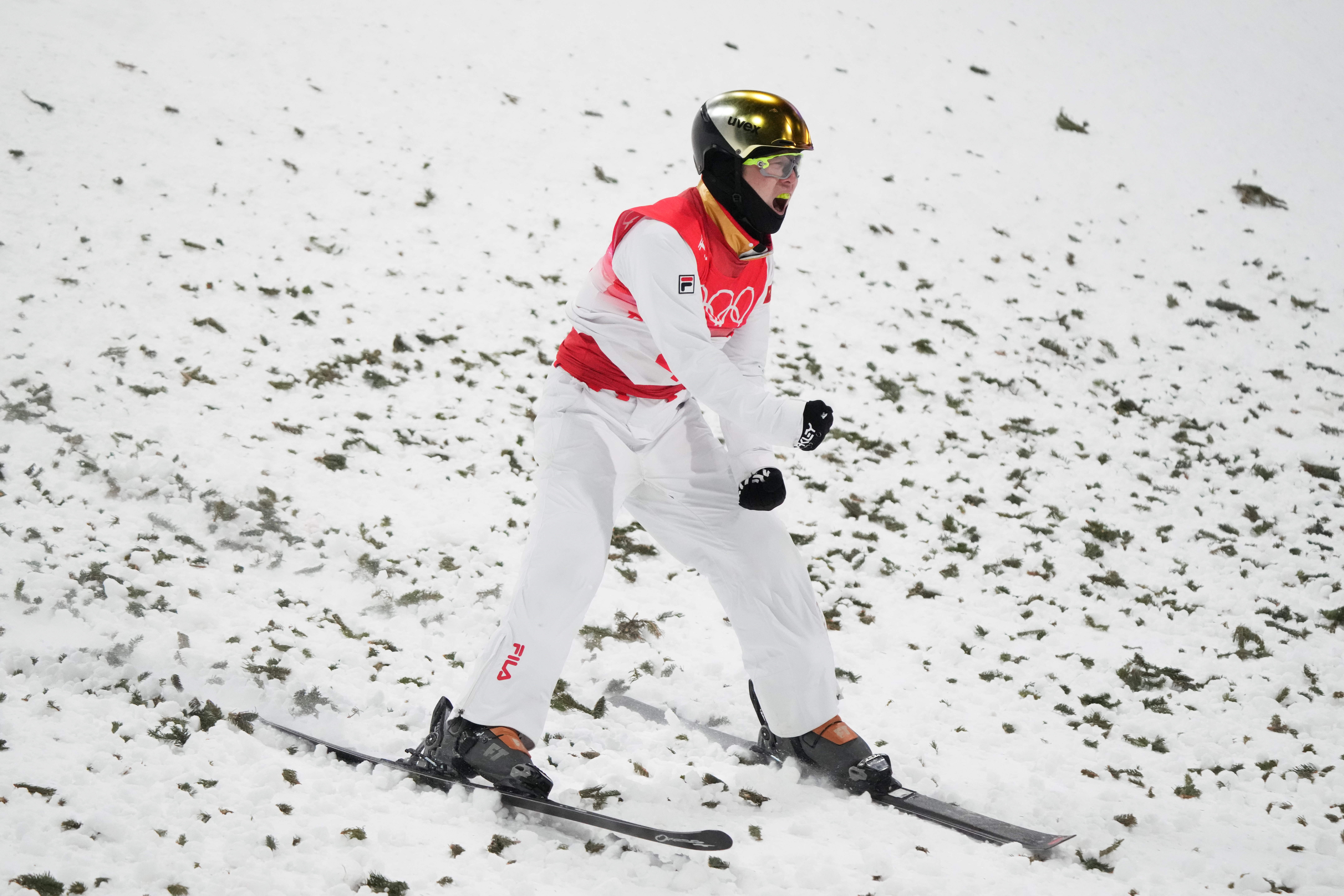 新华社照片,张家口(河北),2022年2月16日 (北京冬奥会)自由式滑雪——男子空中技巧决赛赛况 2月16日,中国选手齐广璞完成动作后庆祝。 当日,北京2022年冬奥会自由式滑雪男子空中技巧决赛在张家口赛区举行。中国选手齐广璞夺得冠军。 新华社记者 王昊飞 摄