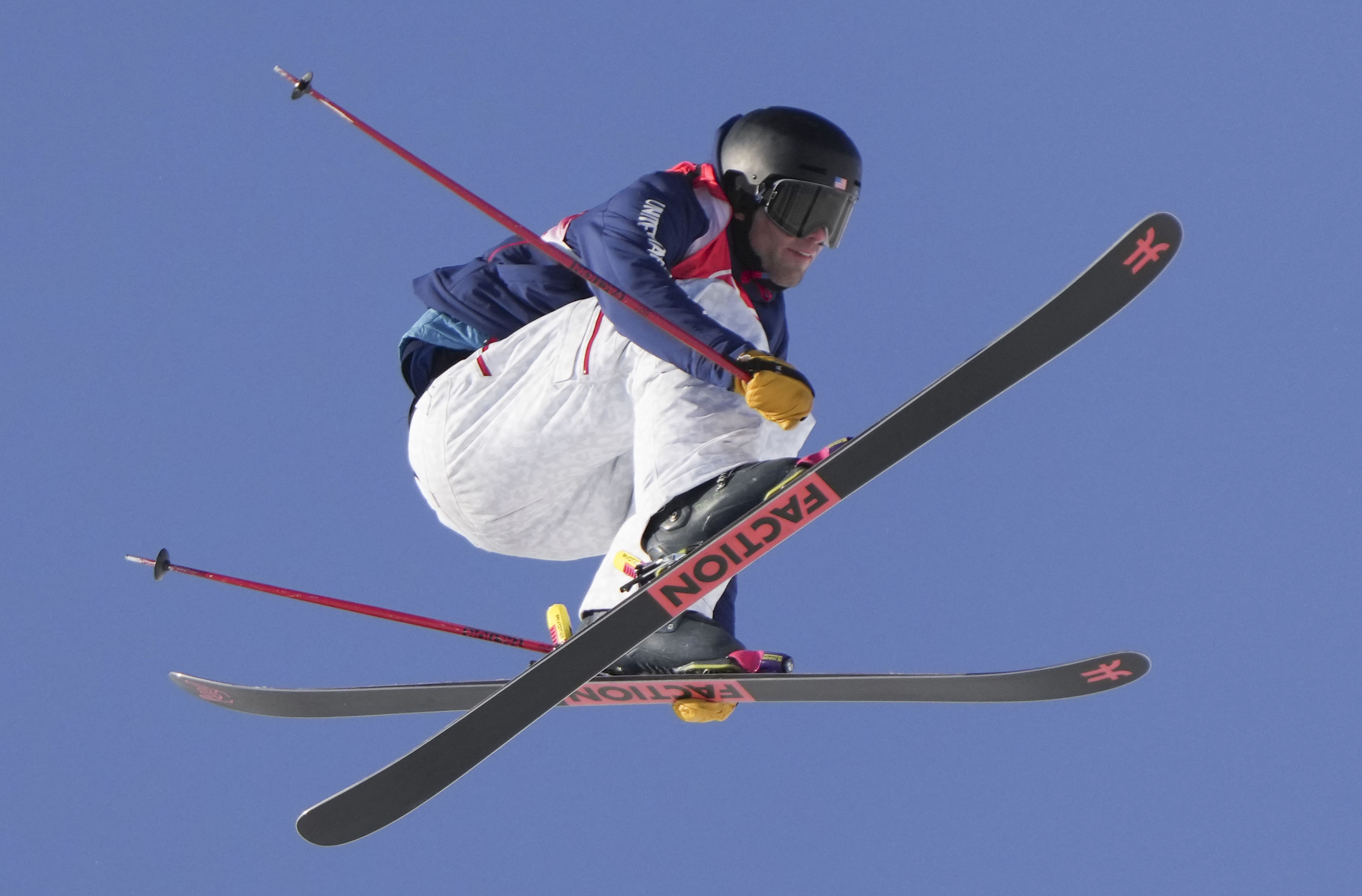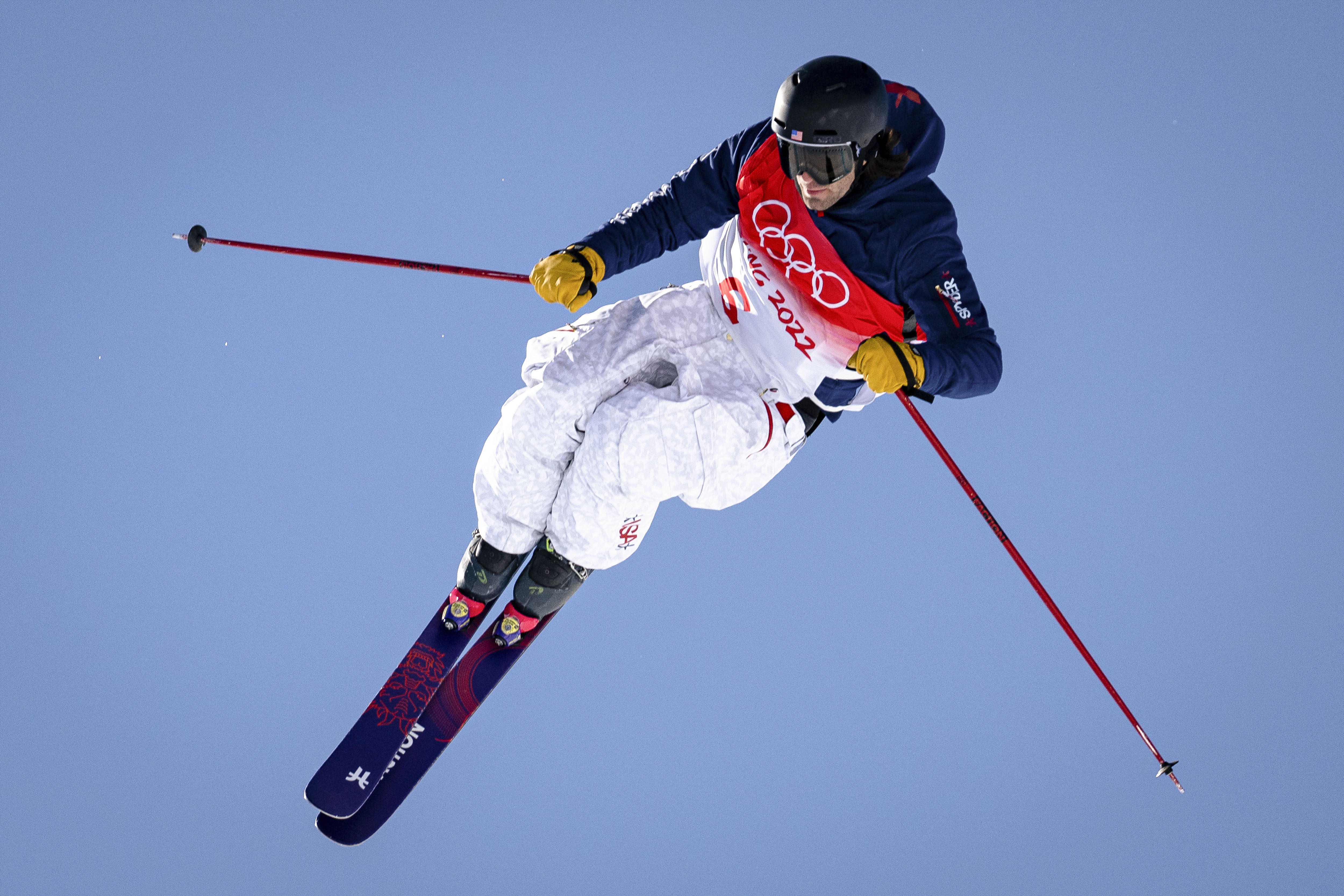 2月16日,美国选手亚历山大·霍尔在北京冬奥会自由式滑雪男子坡面障碍技巧决赛中。新华社记者肖艺九摄