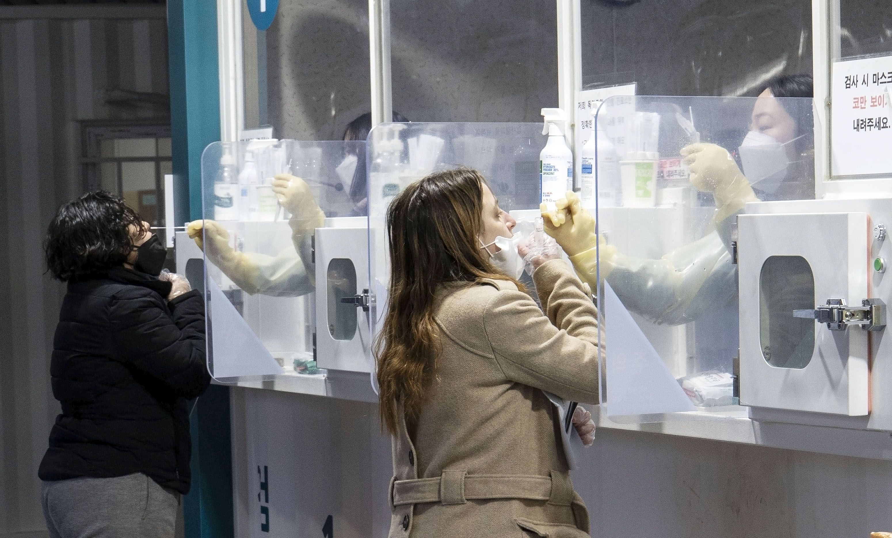 新华社照片,首尔,2022年2月16日 (国际疫情)(1)韩国日增新冠确诊病例超9万例 2月16日,医护人员在韩国首尔一处新冠病毒检测点为检测者采样。 韩国中央防疫对策本部16日通报,韩国前一日新增新冠确诊病例90443例,累计确诊超155万例,新增死亡病例39例,累计死亡7202例。 新华社发(李相浩摄)