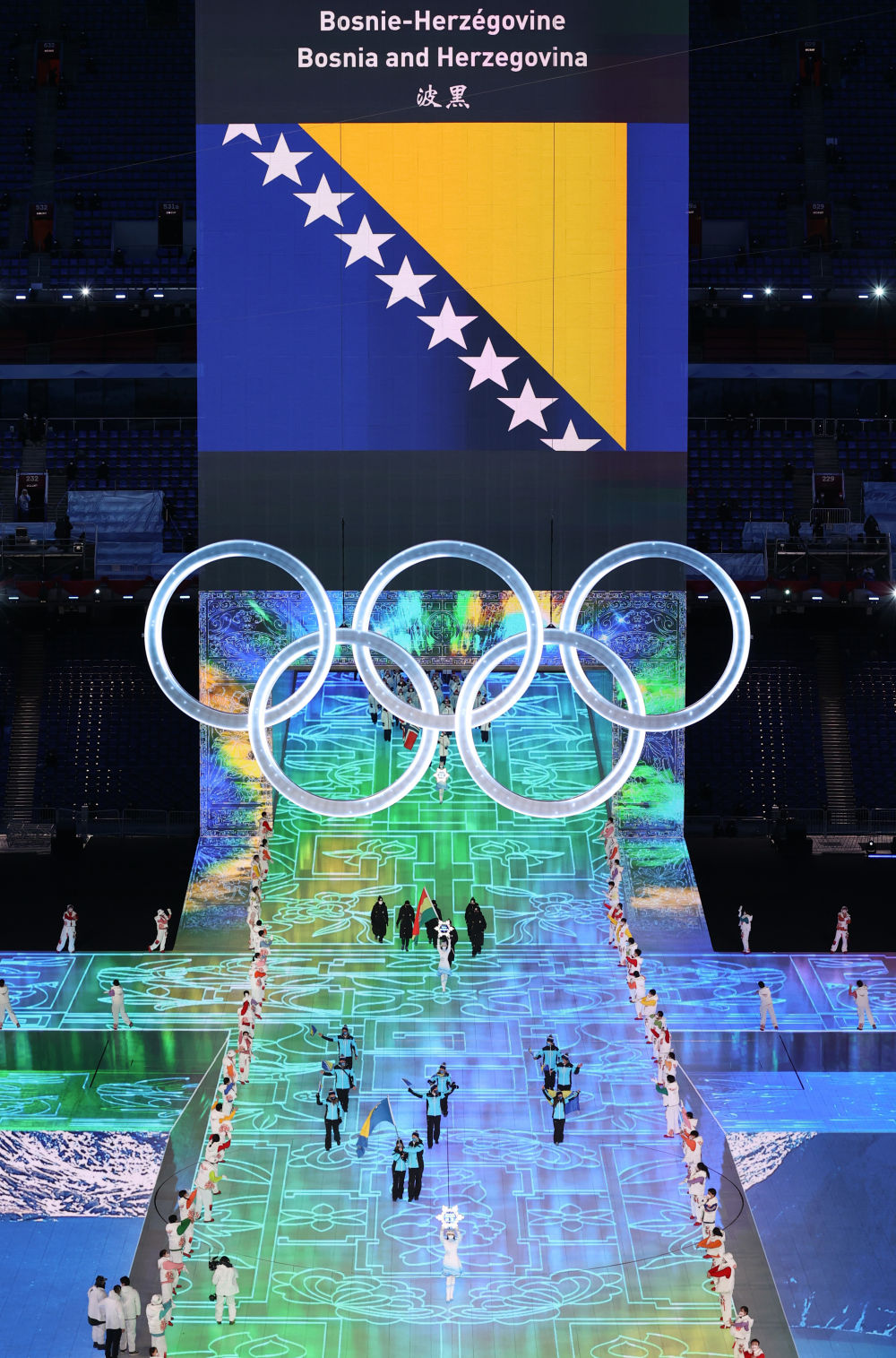 2月4日晚,第二十四届冬季奥林匹克运动会开幕式在北京国家体育场举行。这是波黑代表团在开幕式上入场。新华社记者杨磊摄