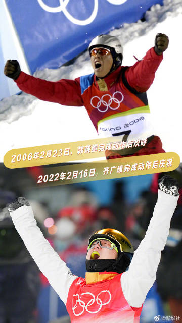 【#齐广璞说让五星红旗再次飘扬在最高处#】2006年,韩晓鹏@自由式滑雪韩晓鹏 在都灵冬奥会自由式滑雪男子空中技巧项目夺冠。今晚,这个项目中国选手时隔16年重夺荣耀,再次祝贺@齐广璞 !此次北京冬奥会,中国选手包揽男女自由式滑雪空中技巧冠军。#这就是中国冰雪人的传承#