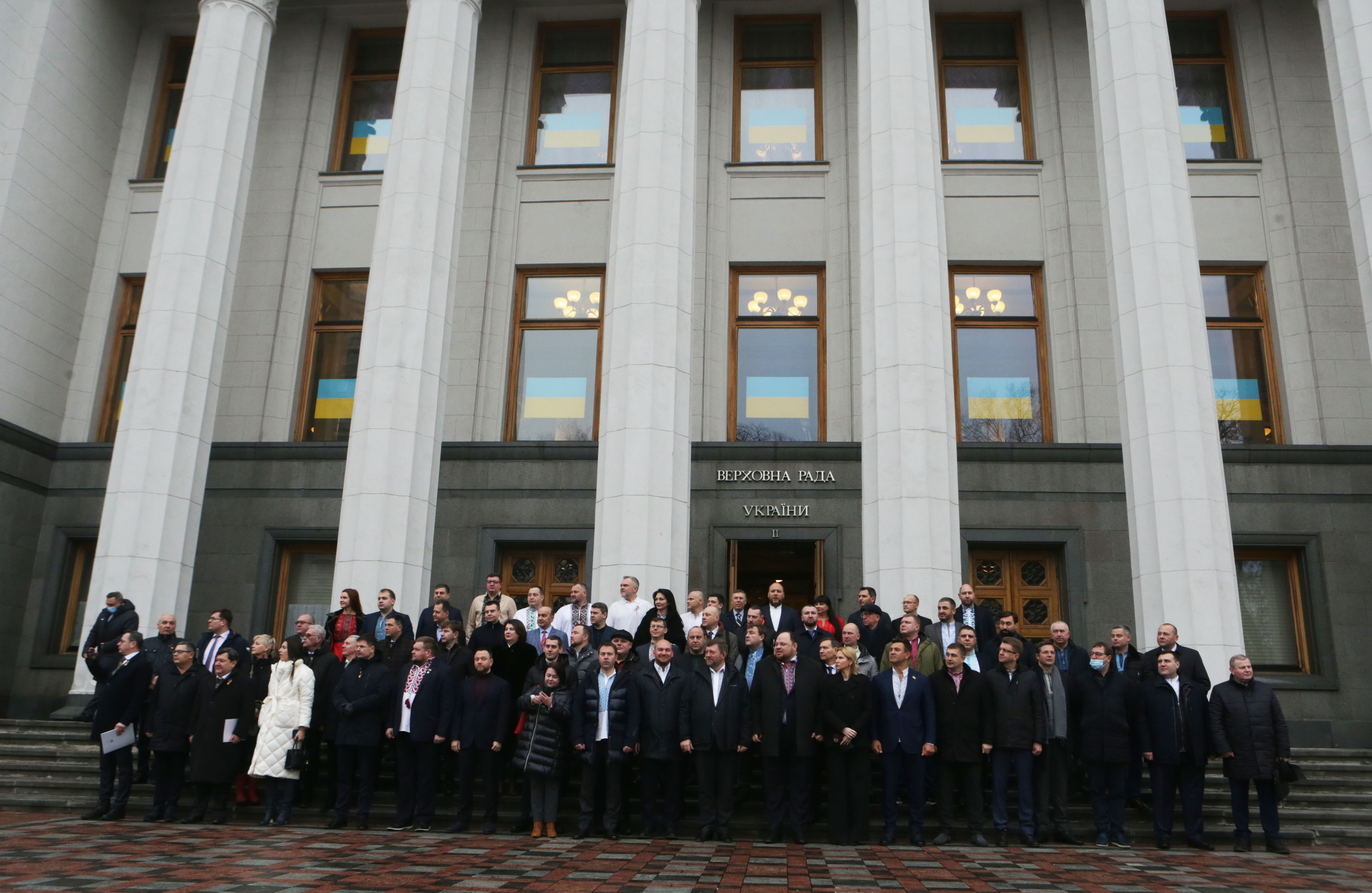 新华社照片,基辅,2022年2月16日 (国际)(4)乌克兰庆祝首个团结日 2月16日,在乌克兰首都基辅,议员们在最高拉达(议会)门前的宪法广场参加团结日庆祝活动。 当日,乌克兰各地举行不同形式的纪念活动,庆祝该国首个团结日。14日,乌克兰总统泽连斯基签署命令,将2月16日定为乌克兰的团结日。 新华社发(谢尔盖·斯塔拉斯坚科摄)