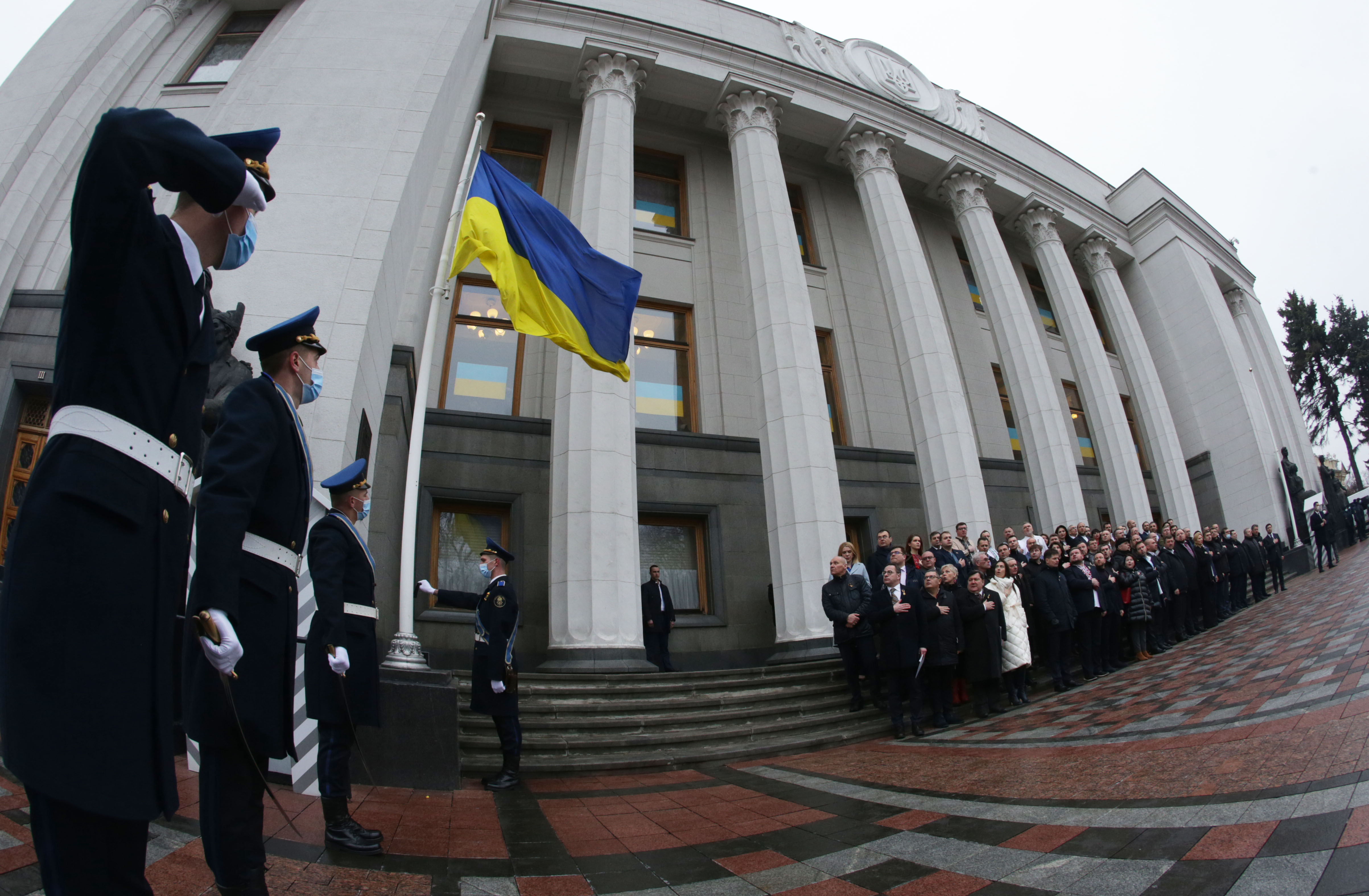 新华社照片,基辅,2022年2月16日 (国际)(1)乌克兰庆祝首个团结日 2月16日,在乌克兰首都基辅,议员们在最高拉达(议会)门前的宪法广场参加团结日庆祝活动。 当日,乌克兰各地举行不同形式的纪念活动,庆祝该国首个团结日。14日,乌克兰总统泽连斯基签署命令,将2月16日定为乌克兰的团结日。 新华社发(谢尔盖·斯塔拉斯坚科摄)