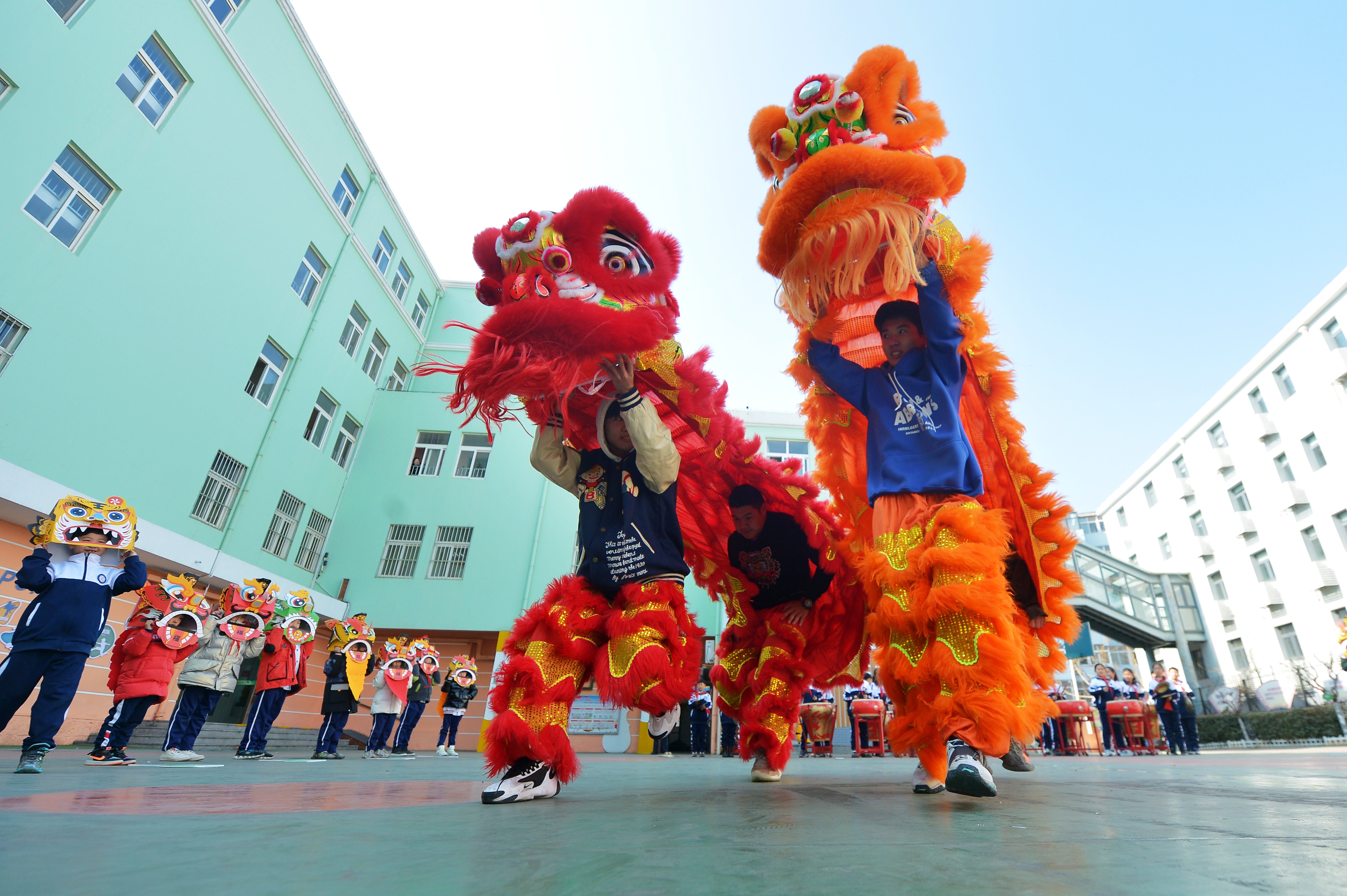 新华社照片,青岛(山东),2022年2月16日 多彩活动迎接新学期 2月16日,在山东青岛大名路小学,学生观看舞狮表演。 当日,各地学校、幼儿园组织丰富多彩、形式多样的活动欢迎孩子们返校,喜迎新学期的到来。 新华社发(王海滨 摄)