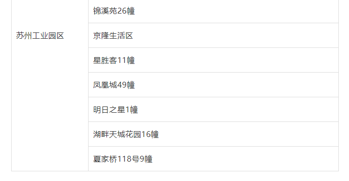苏州工业园区:星胜客11幢、凤凰城49幢、明日之星1幢、湖畔天城花园16幢、夏家桥118号9幢