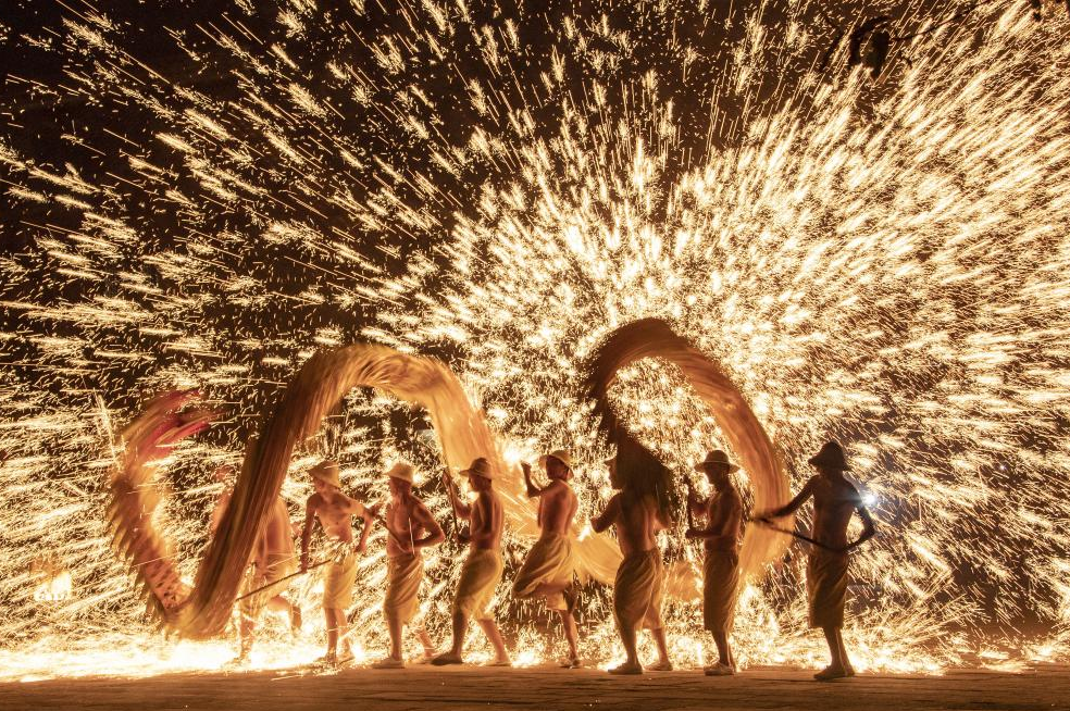 四川省成都市黄龙溪古镇上演火龙灯舞。