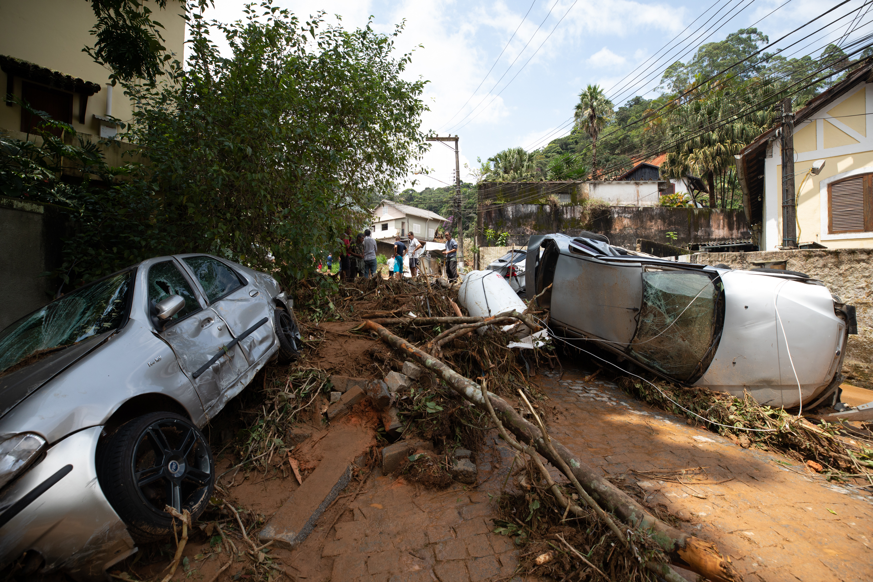 新华社照片,里约热内卢,2022年2月17日 (国际)(6)巴西里约州暴雨灾害死亡人数升至78人 2月16日,在巴西里约热内卢州彼得罗波利斯市,倒下的树木和受损的汽车堵塞道路。 巴西里约热内卢州消防部门16日说,位于该州内陆山区的彼得罗波利斯市15日骤降暴雨引发多起山体滑坡,多条道路被暴涨的河水淹没,造成的死亡人数目前已升至78人。 新华社记者 王天聪 摄
