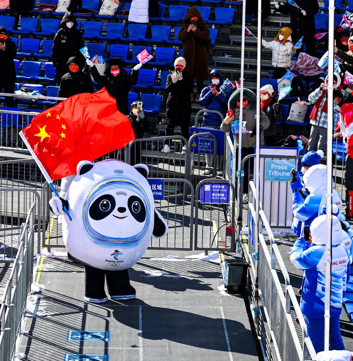 2月16日,吉祥物“冰墩墩”在现场和观众互动。新华社记者连振摄