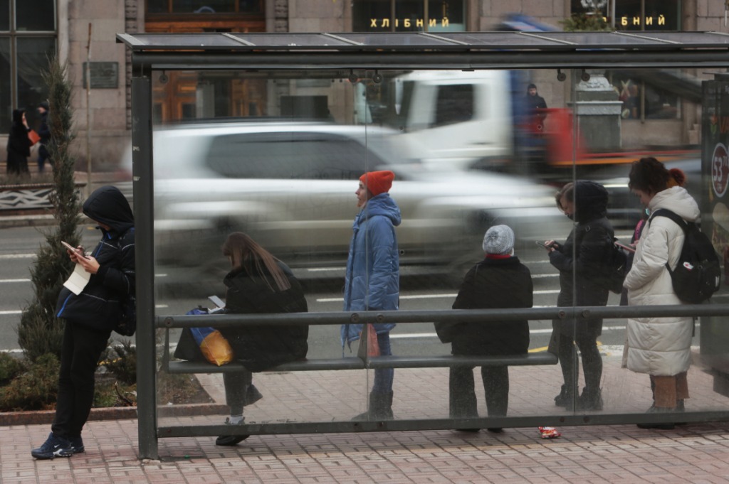 2月10日,市民在乌克兰基辅一处公交站等车。(新华社发,谢尔盖·斯塔拉斯坚科摄)