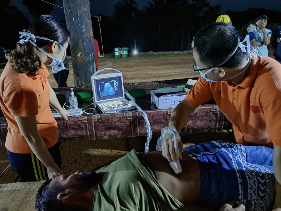 2月12日,中国医疗队在圭亚那中资企业荣安公司林区驻地为工人做检查。(新华社发,医疗队供图)