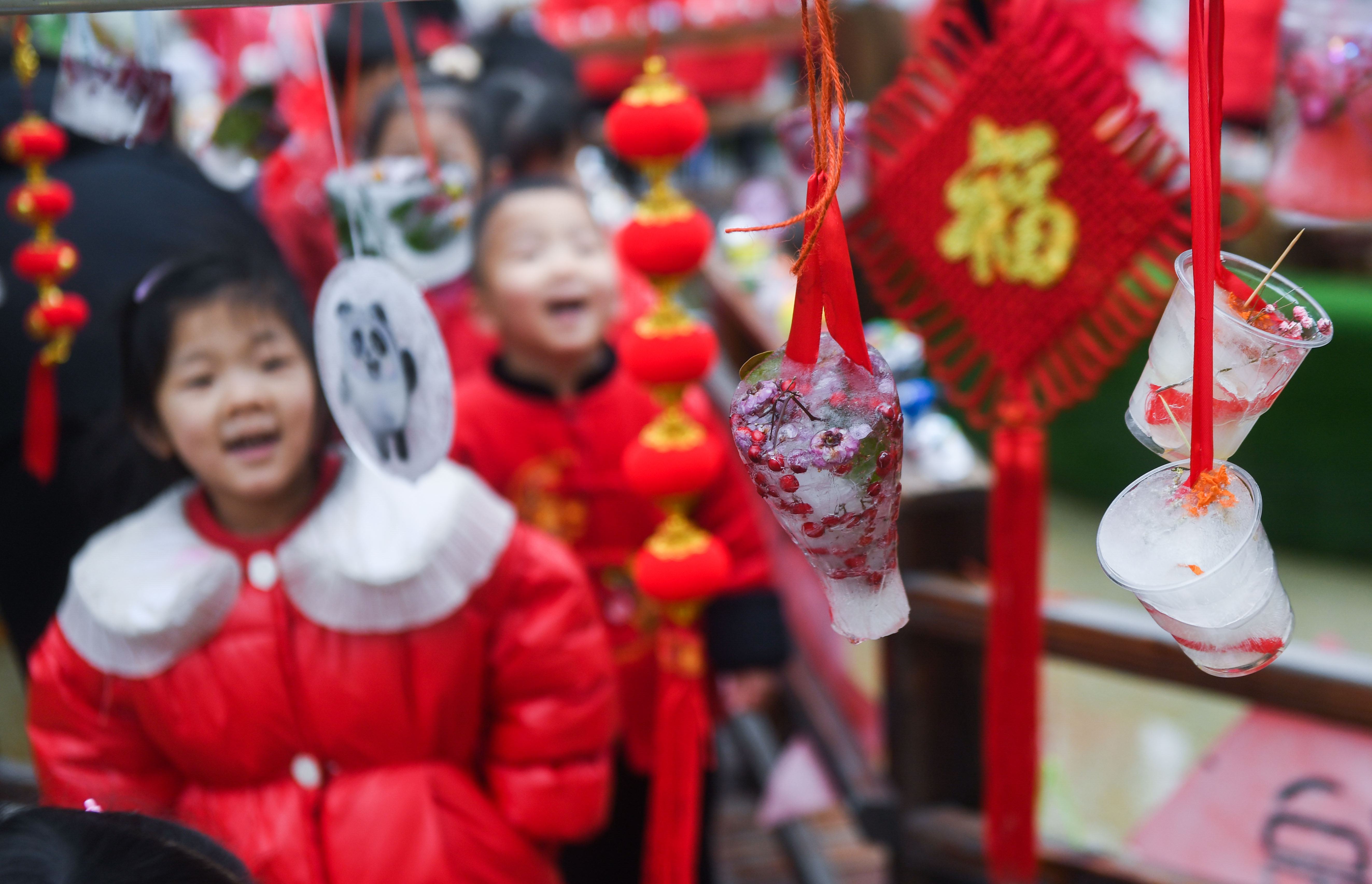 新华社照片,长兴(浙江),2022年2月17日 校园“冰雪第一课” 2月17日,孩子们在校园里参观“冰晶晶”作品展。 当日,浙江省湖州市长兴县中心幼儿园在开学首日开展“冰雪第一课”,孩子们和教师一起用水、植物等材料手工制作冰花瓶、冰挂件等,并将作品集中起来办校园“冰晶晶”作品展。“冰雪第一课”活动让孩子们感知冰与水的关系,培养孩子们科学实践与探究的兴趣。 新华社记者 徐昱 摄
