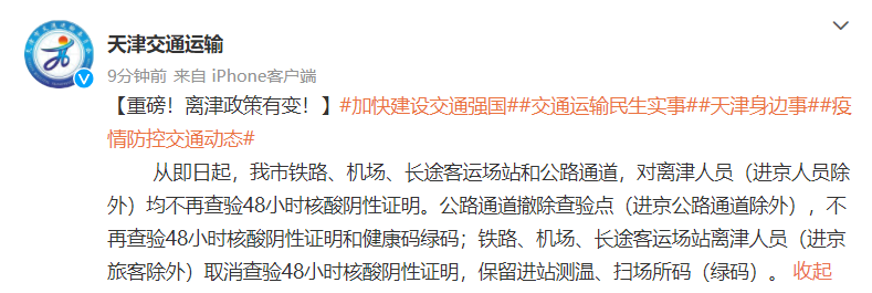 据@天津交通运输 消息,从即日起,天津铁路、机场、长途客运场站和公路通道,对离津人员(进京人员除外)均不再查验48小时核酸阴性证明。公路通道撤除查验点(进京公路通道除外),不再查验48小时核酸阴性证明和健康码绿码;铁路、机场、长途客运场站离津人员(进京旅客除外)取消查验48小时核酸阴性证明,保留进站测温、扫场所码(绿码)。