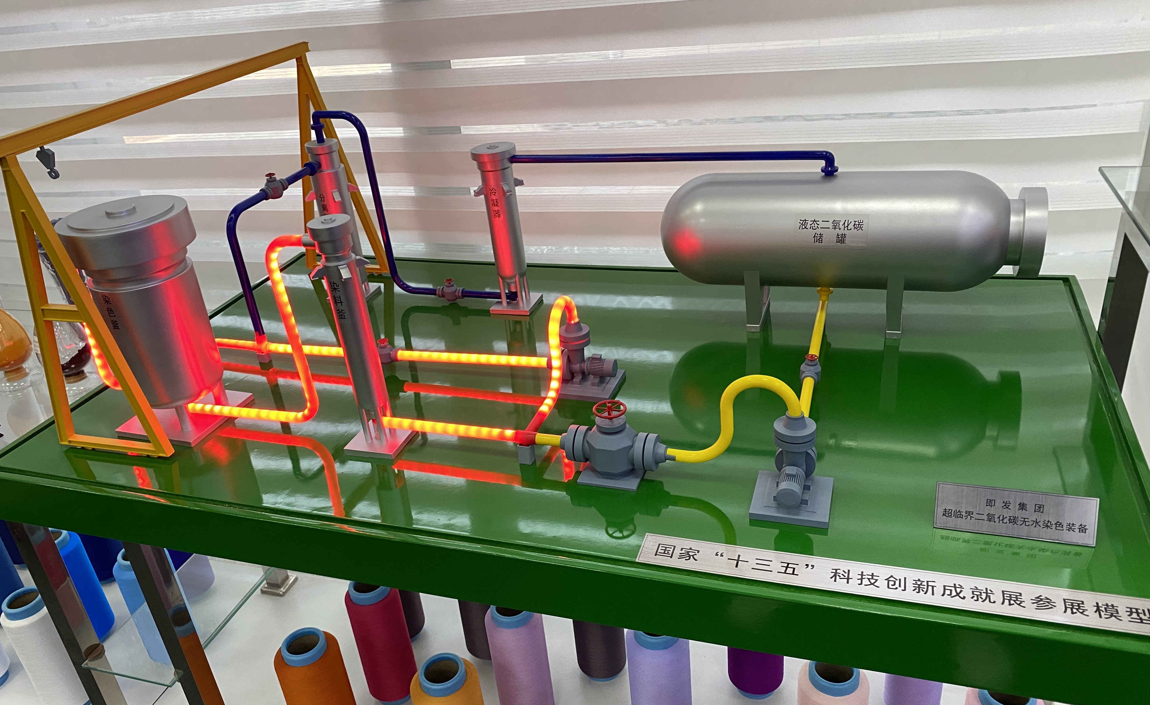 企业选择走上一条“根治”之路:用超临界二氧化碳流体替代染色水。他们与科研院所合作,前后历时7年,经过5000多次周期性研究试验,投资逾1亿元,直至2021年6月取得成功,超临界二氧化碳无水染色产业化示范线试运行,形成了年产1000吨生产能力,并申请国内外专利59项。