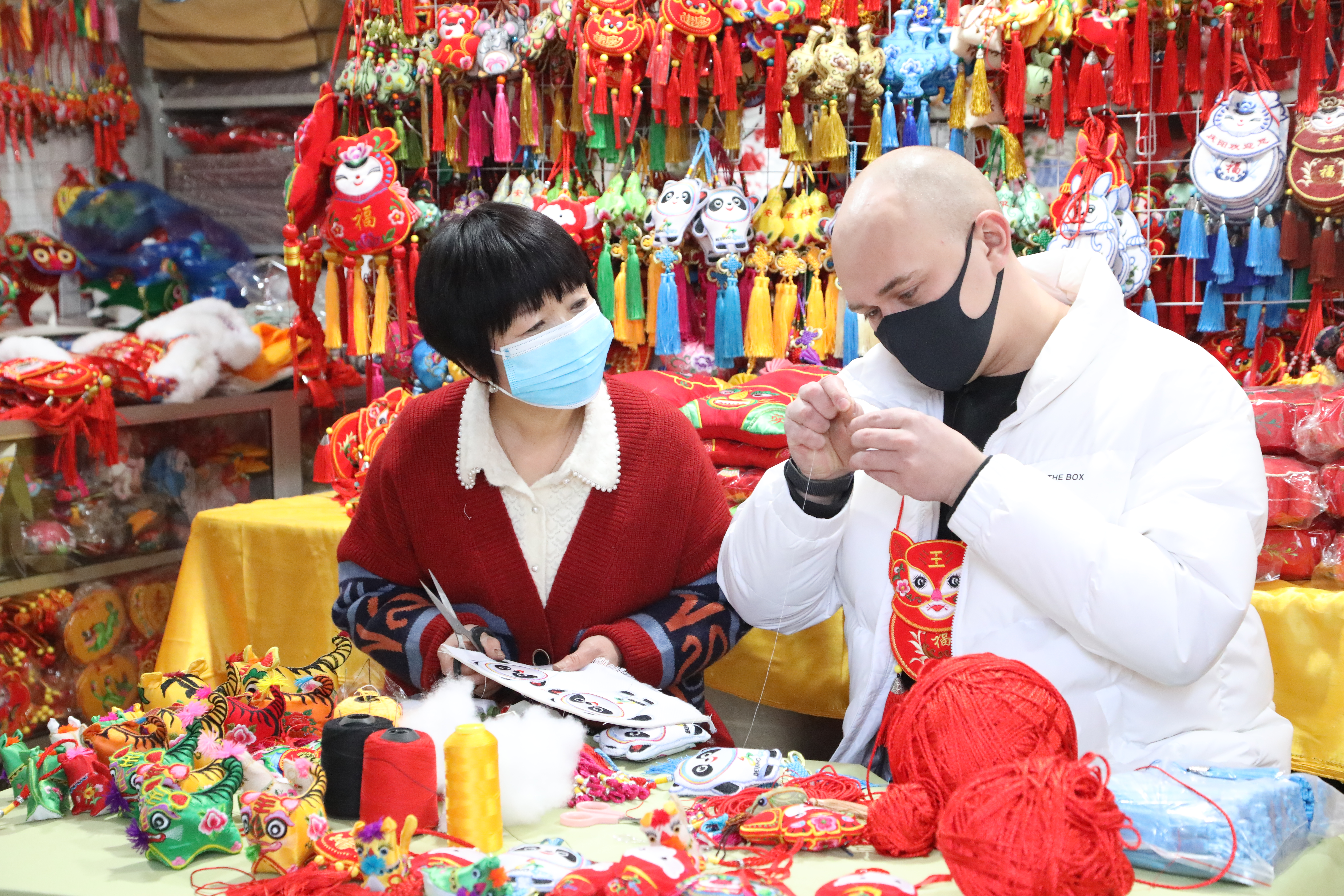 2022年2月8日,谢尔盖在民间艺人工作坊学习香包刺绣。新华社发 梁军 摄