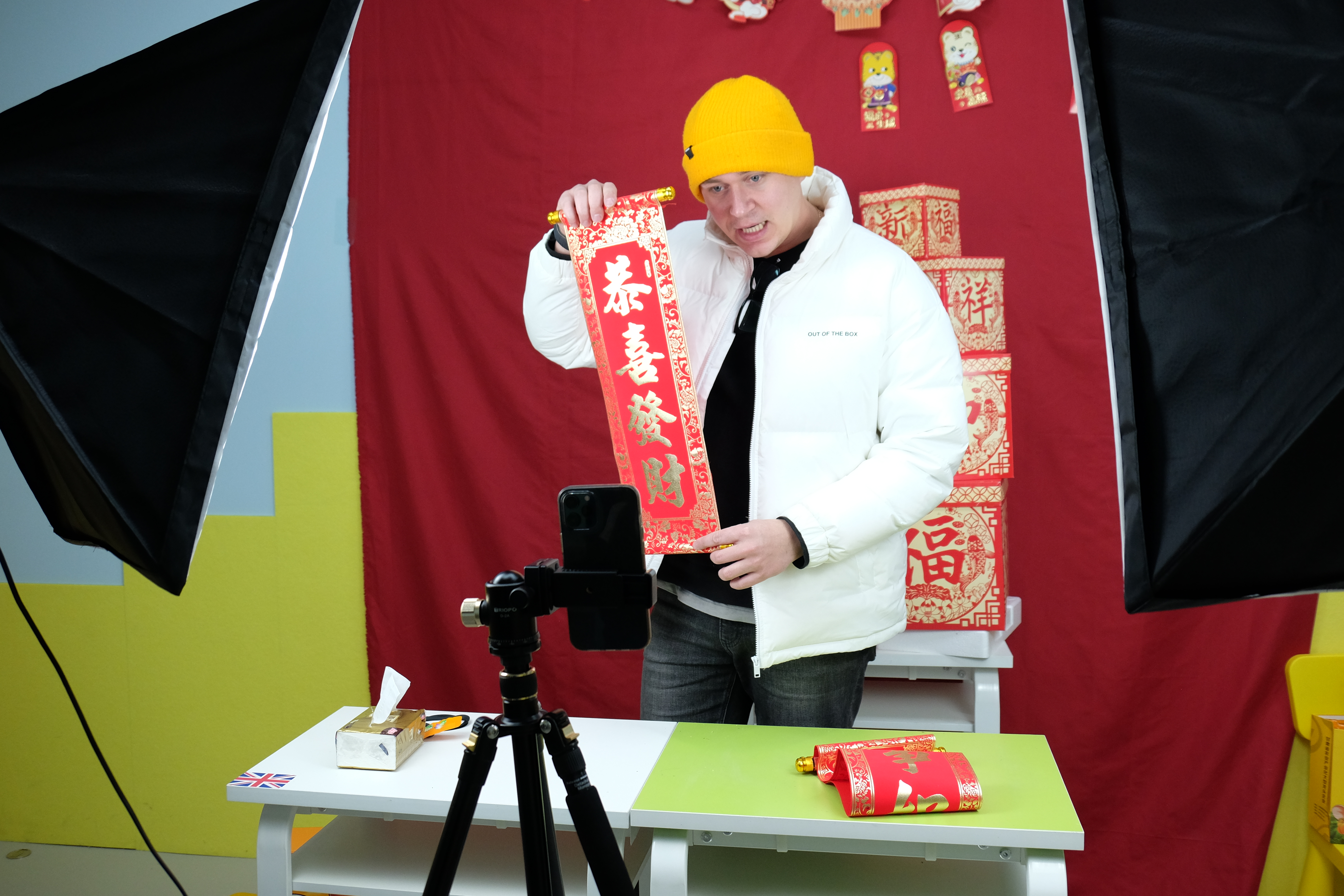 “各位家人们,祝你们新年快乐!”在一间工作室里,谢尔盖手持春联,通过手机直播平台,向自己的中国粉丝问好。