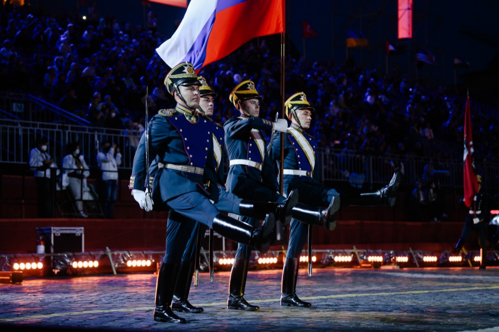 2021年8月27日,俄罗斯总统卫队在军乐节上表演。(新华社发,叶甫盖尼·西尼岑摄)