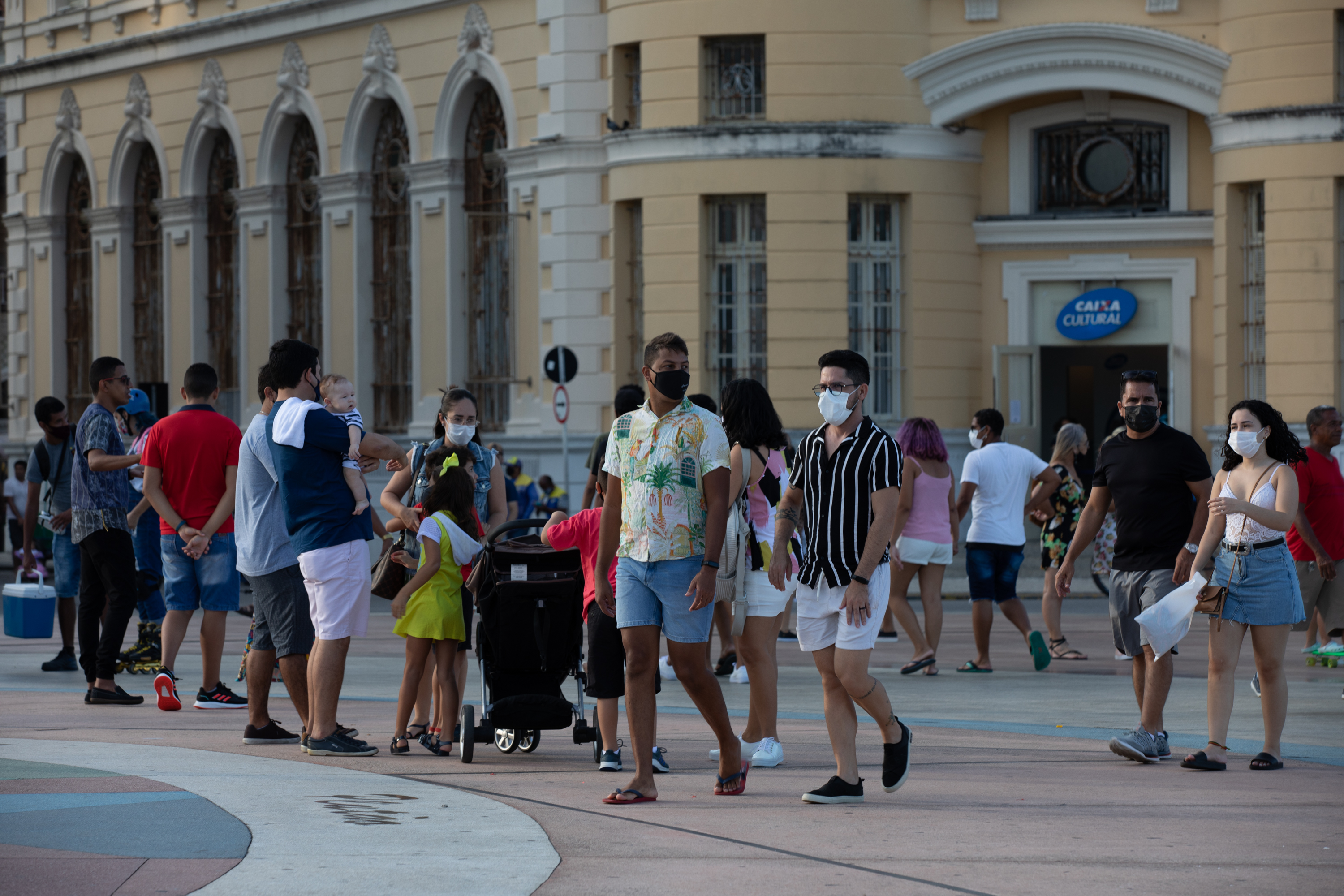 2022年1月30日,人们在巴西累西腓戴口罩出行。(新华社记者王天聪摄)