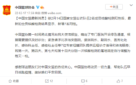 据中国篮协官微消息,继2月14日国家女篮出访队伍2名成员核酸检测阳性后,最新的全员核酸检测结果显示,新增7名阳性。