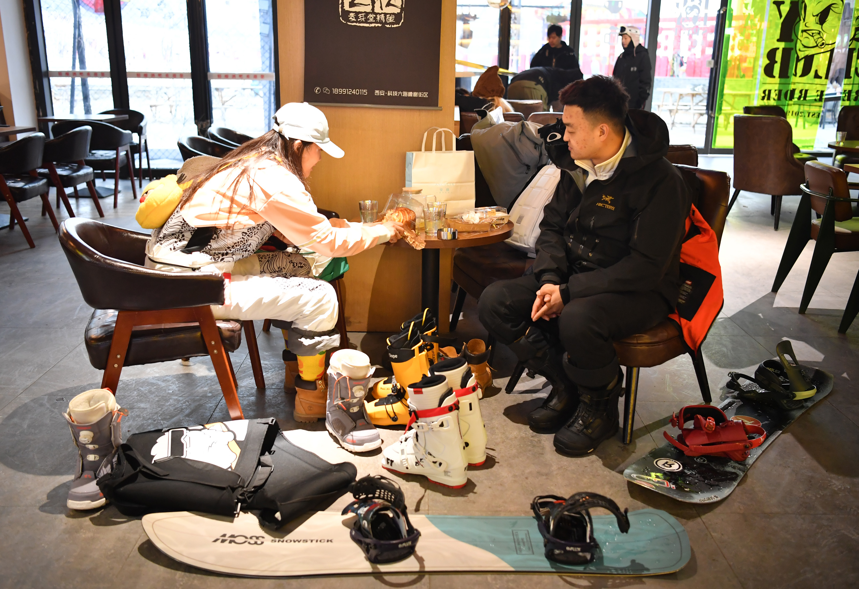 新华社照片,西安,2022年2月17日 陕西:冰雪经济蓬勃发展 2月14日,在陕西太白县鳌山滑雪场内,滑雪爱好者在餐厅休息。 近年来,随着陕西省冰雪运动场馆建设水平逐步提高,越来越多群众参与到冬季运动之中,激发门票、培训、服务业、器材装备等冰雪消费快速增长。据不完全统计,目前陕西省累计参与冰雪运动人数达到540万人,带动体育消费50多亿元;其中2020至2021年,陕西省滑雪场带动体育消费增长达10多亿元。 新华社记者 邵瑞 摄
