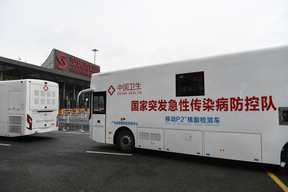 2月17日,移动核酸检测车、物资保障车从深圳湾口岸赴香港支援。新华社记者 梁旭 摄