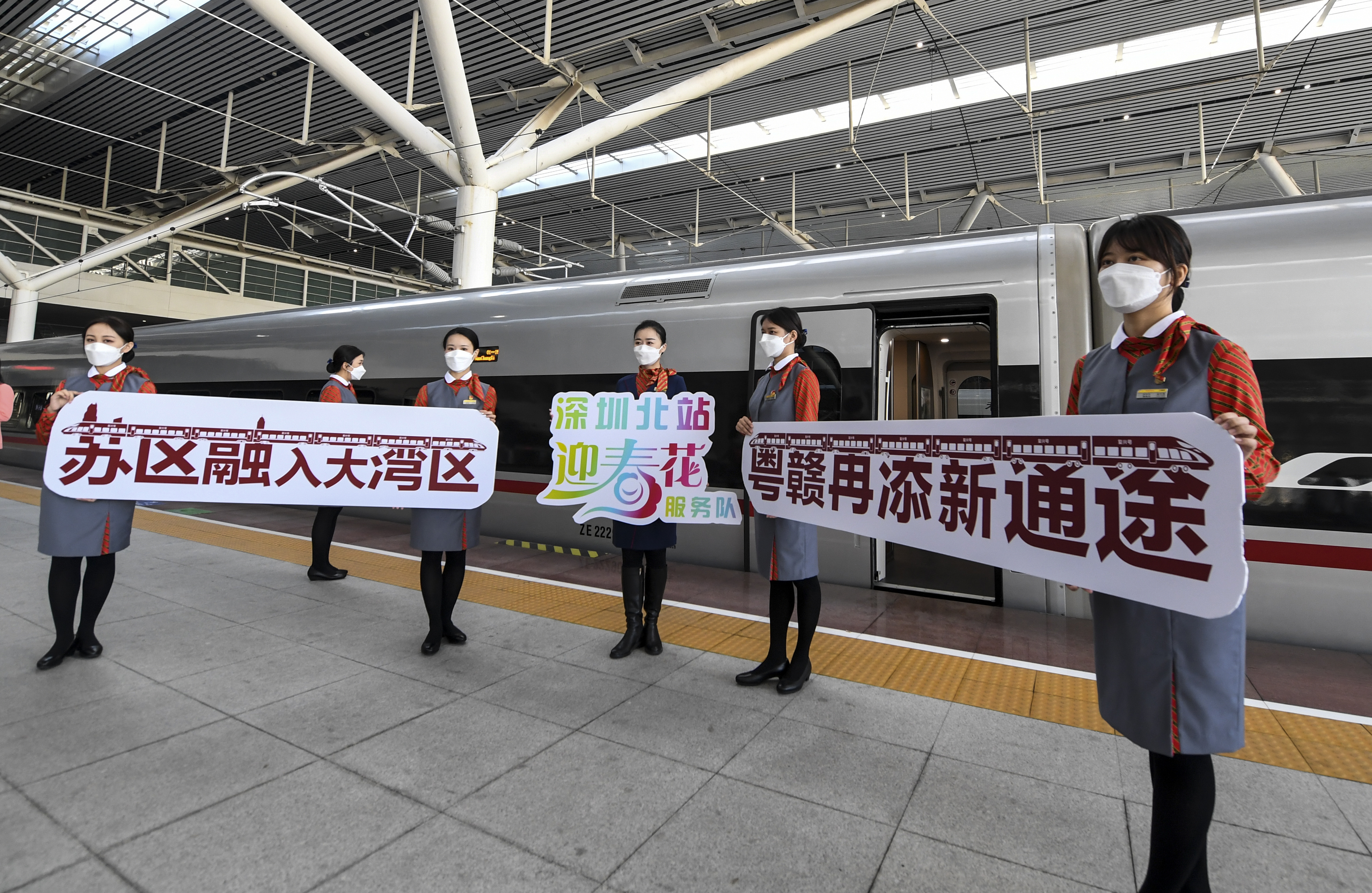 新华社照片,北京,2022年2月17日 向着复兴梦想的新跨越——新时代中国经济社会发展述评 2021年12月10日,深圳北站工作人员在赣深高铁深圳北站开往南昌西站的首班列车前留影。 (配本社同题文字稿) 新华社记者 毛思倩 摄